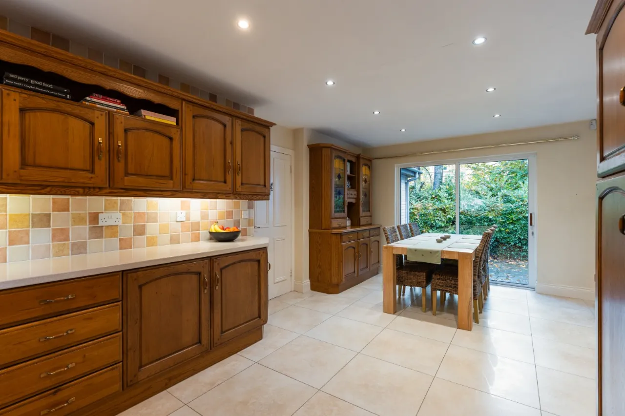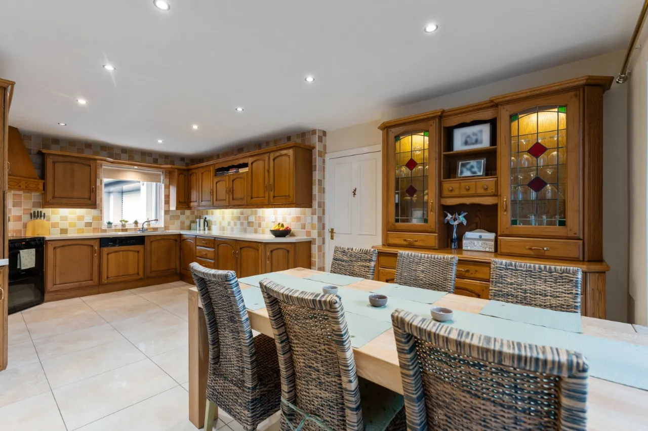 Excellent range of solid hardwood fitted units, 1.5 drainer stainless steel sink unit with mixer taps, integrated Miele dishwasher, recess for electric cooker with concealed extractor hood, integrated microwave, integrated fridge, partly tiled walls, fitted dresser with glazed units, casual dining for 6, sliding door to side, tiled floor, recessed lighting, access to annex.
