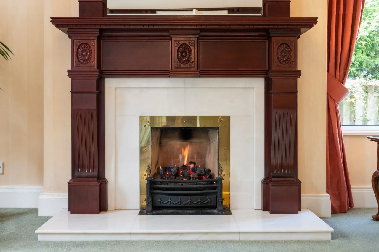 Hardwood fireplace with mirror above, marble inset and gas fire and marble hearth, plate shelf, corniced ceiling, ceiling rose.