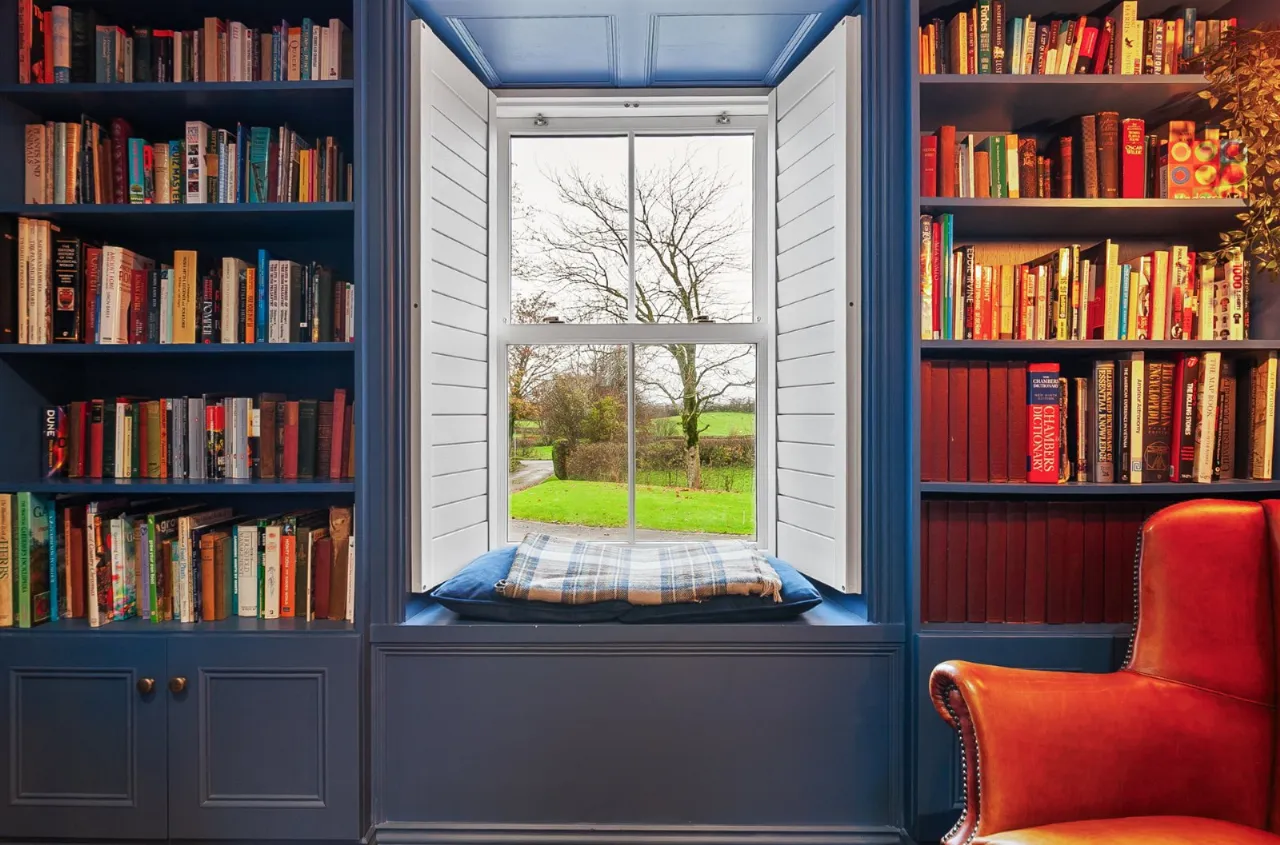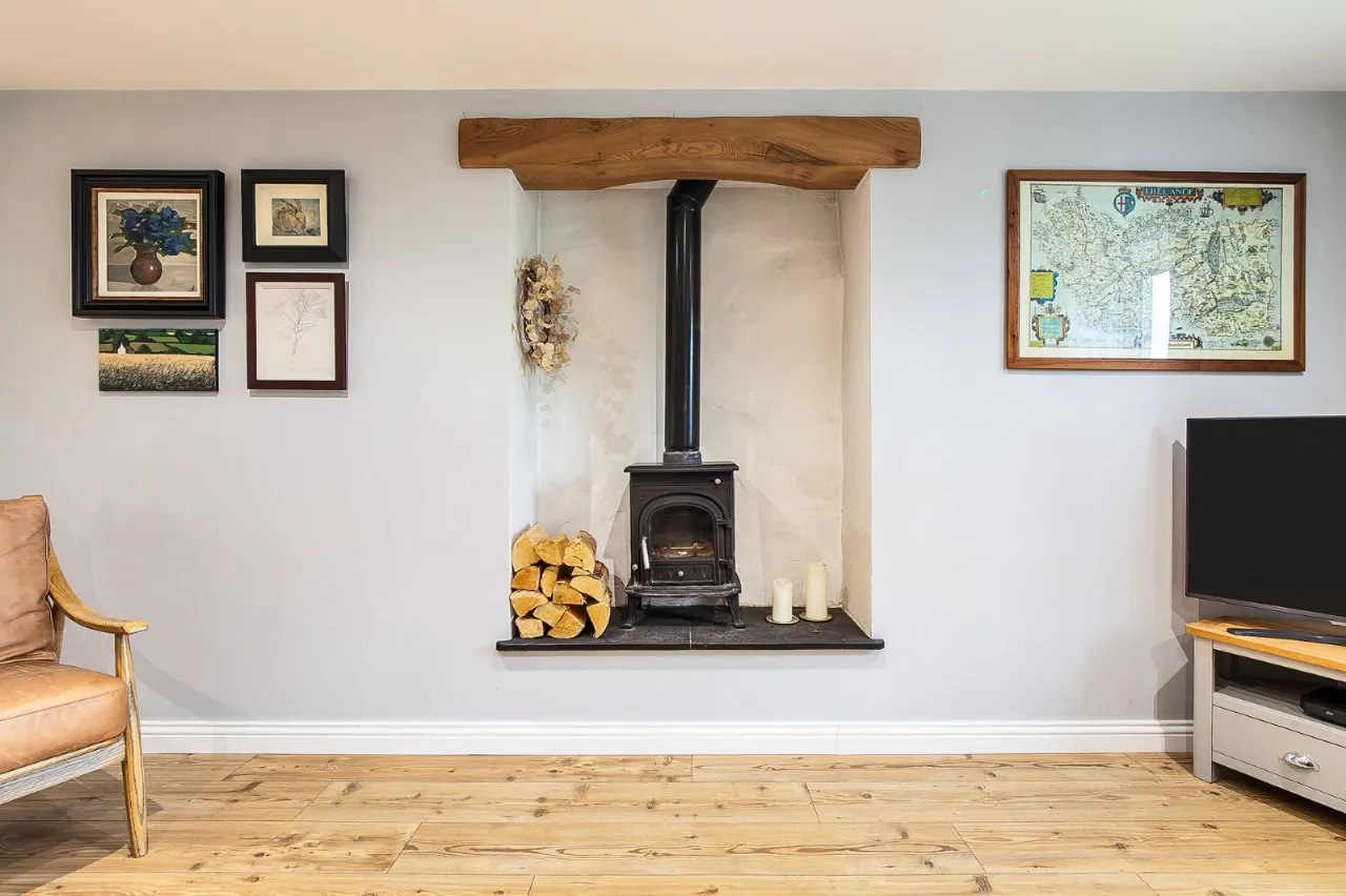 Solid wooden flooring, exposed stone walls, wood burning stove on tiled hearth