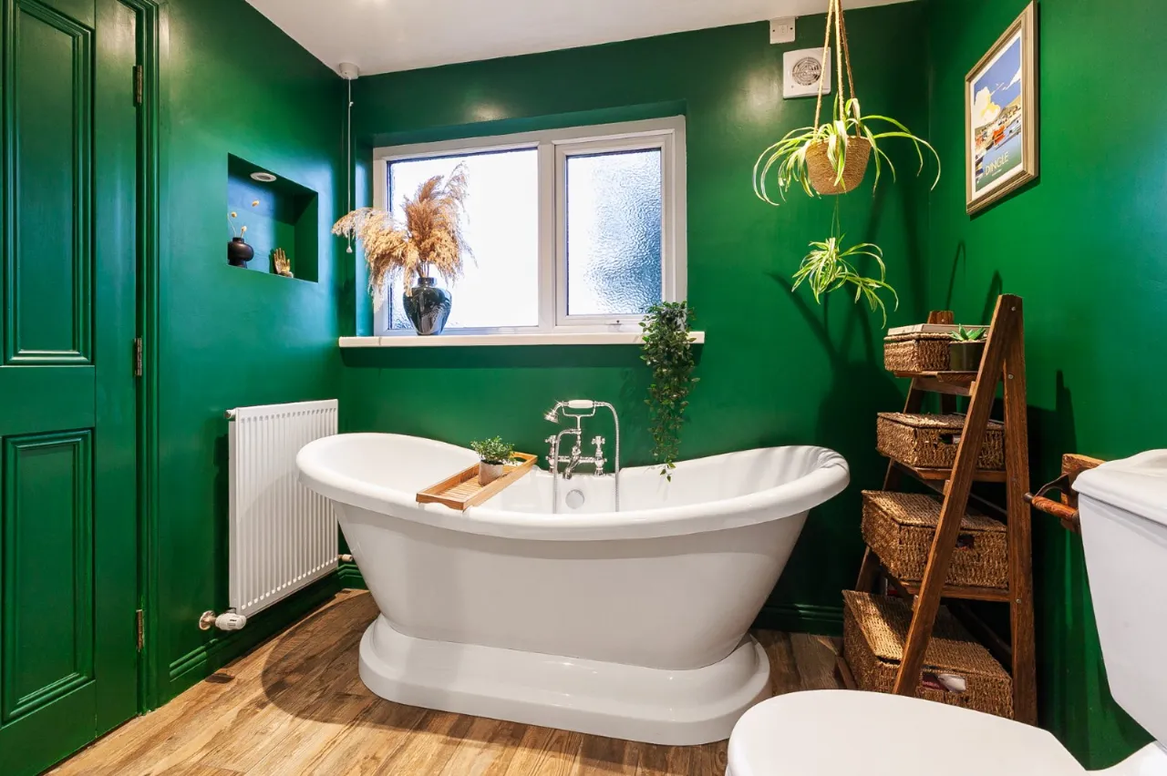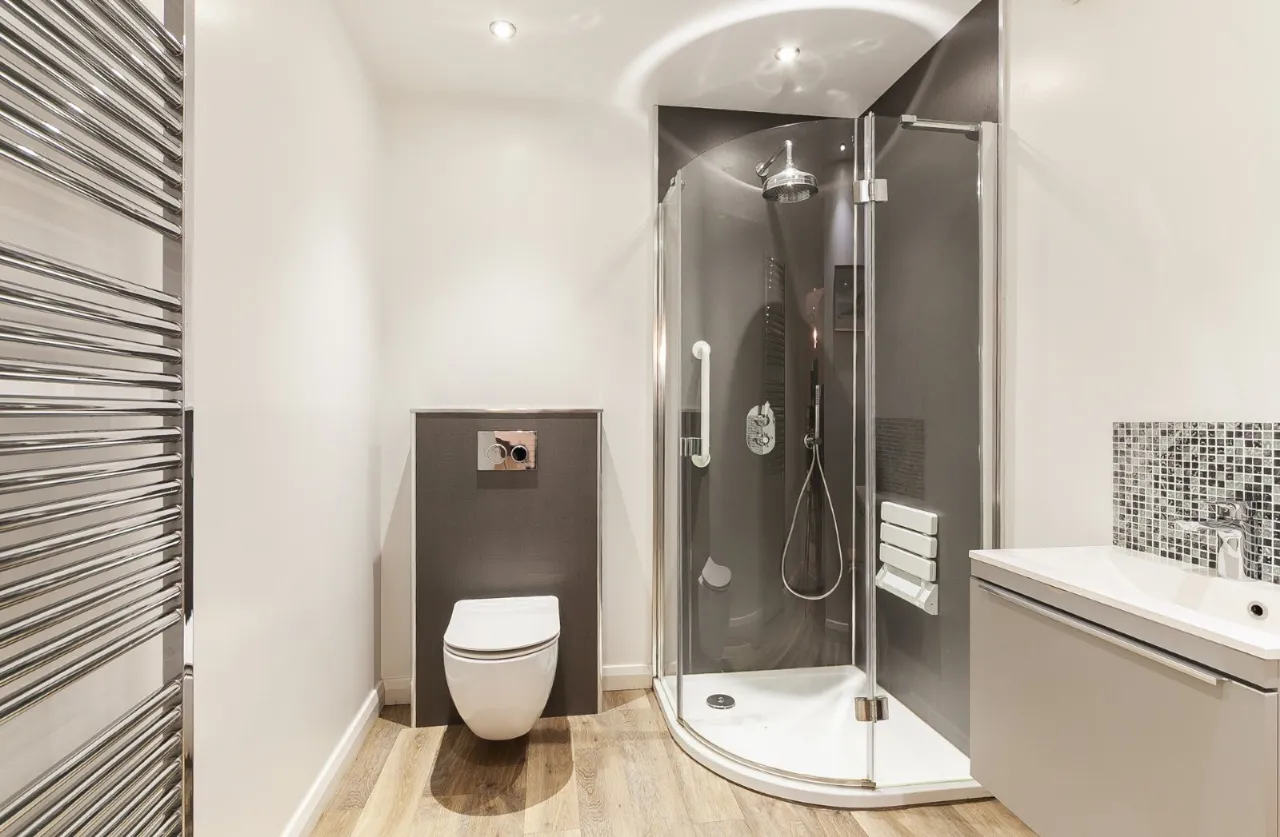 Modern white suite comprising free standing bath, WC, wash hand basin in vanity unit, corner shower cubicle and heated towel rail.