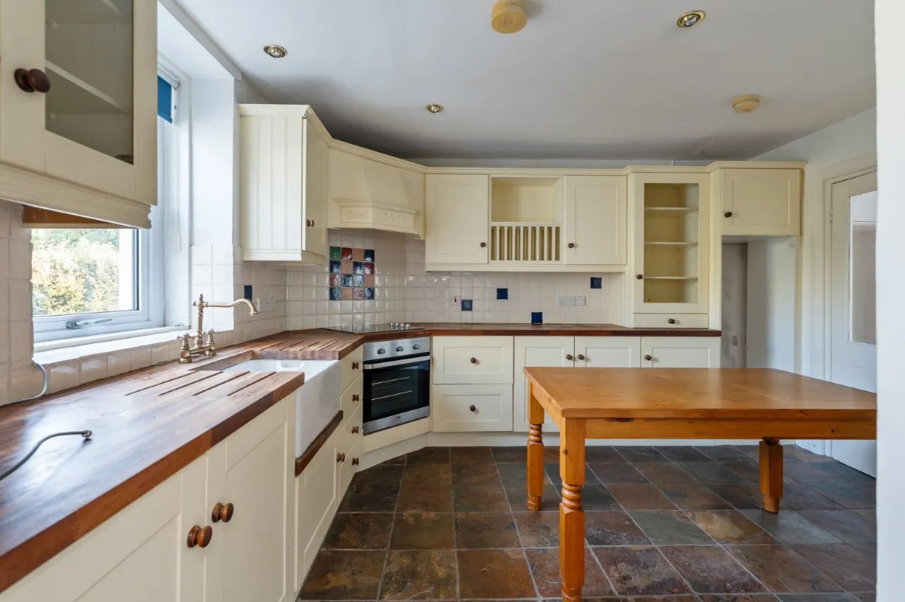 Range of high and low level units, old Belfast style sink unit, integrated stainless steel oven and four ring electric hob, extractor hood, picture rail, oil fired Aga
