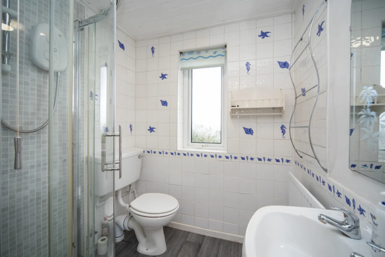 Comprises of full white suite, low flush WC, pedestal wash hand basin, enclosed corner shower unit with electric shower, laminate floor and tiled walls.