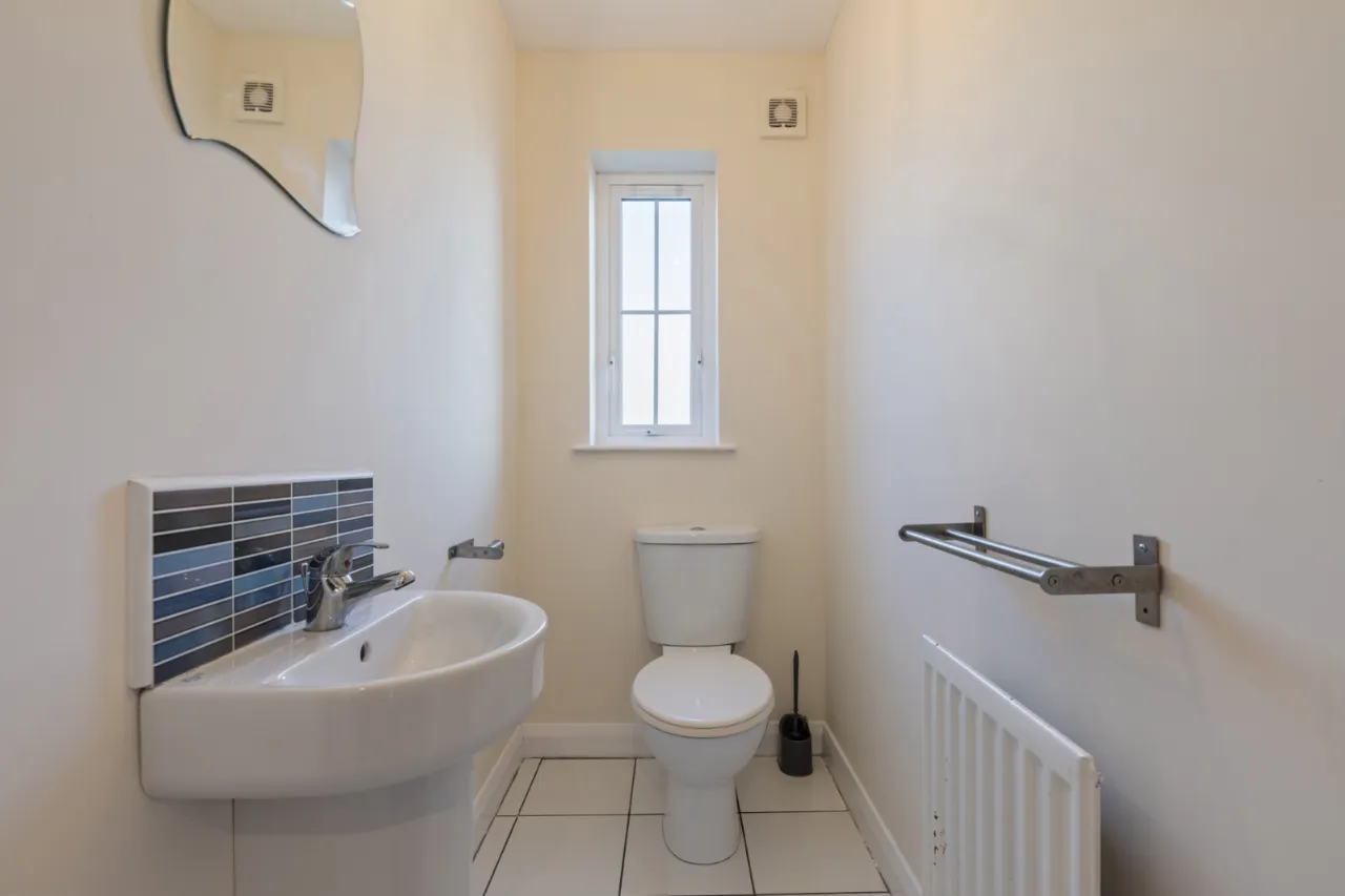 Low flush WC, wash hand basin with mixer taps and tiled splashback, extractor fan, tiled floor.