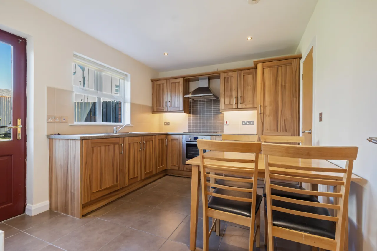 High and low level wooden units, single bowl stainless steel sink unit with mixer taps, under bench oven with 4 ring induction hob and overhead stainless steel extractor unit, integrated washing machine, fridge and freezer, part tiled walls, tiled floor, recessed lighting, access to rear garden.