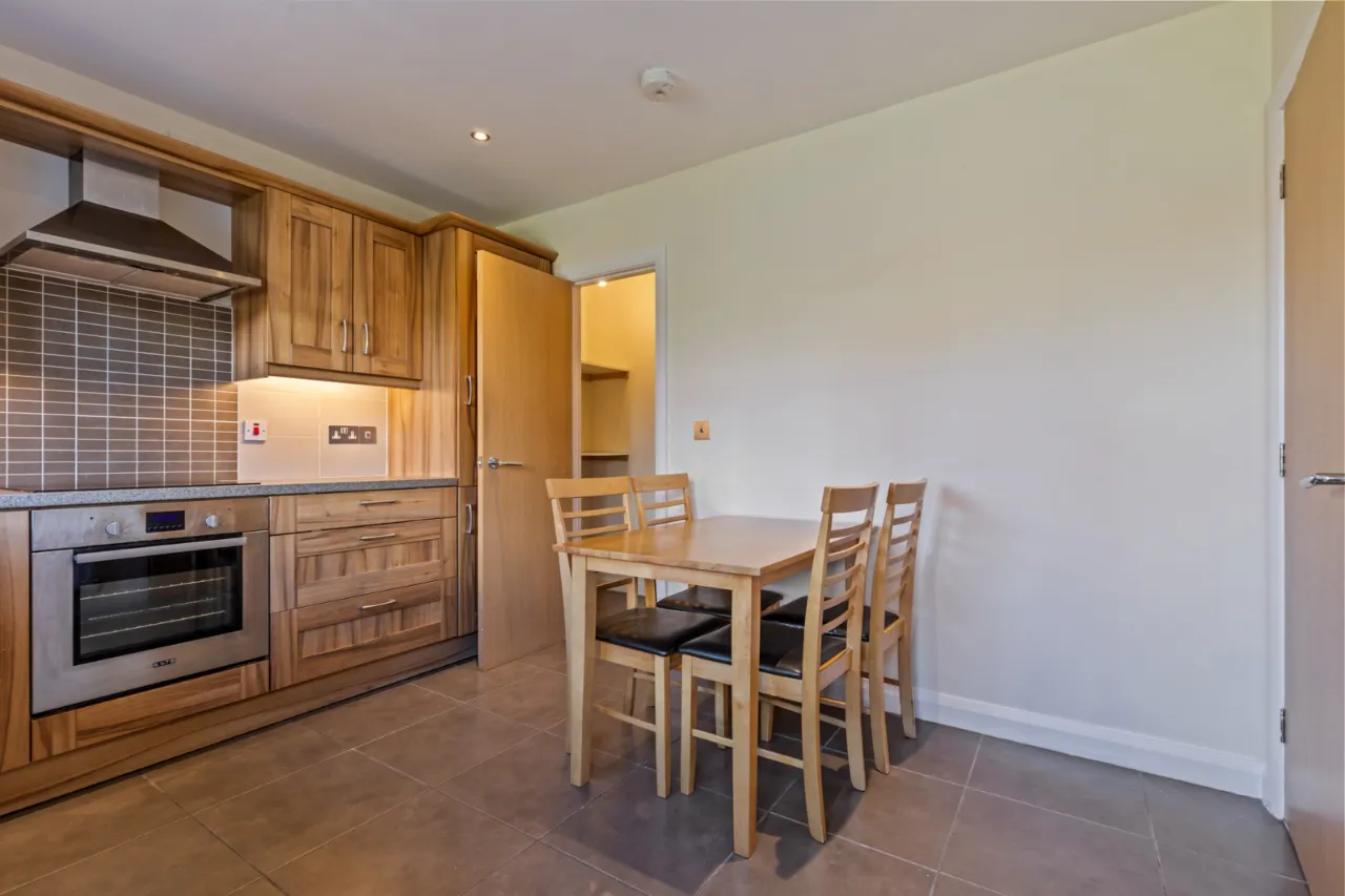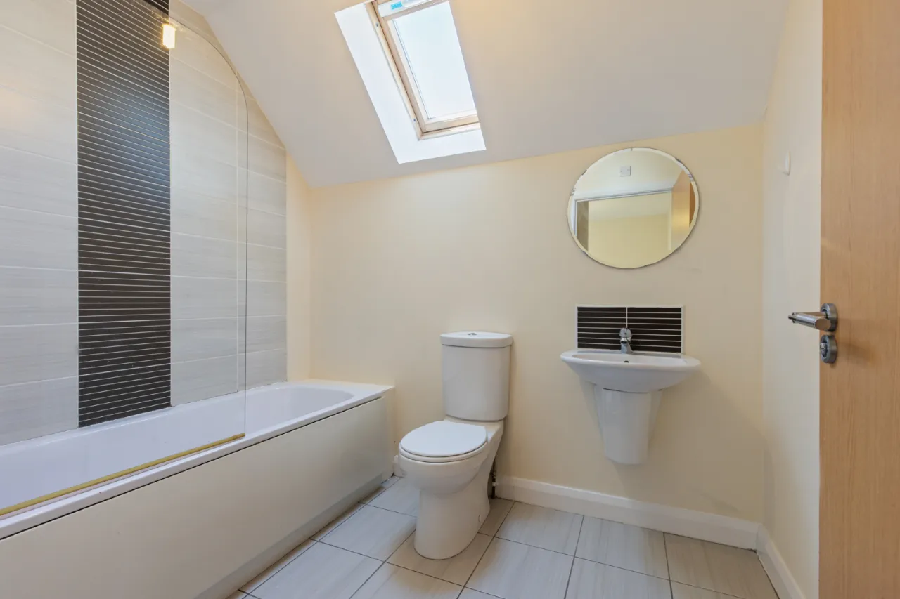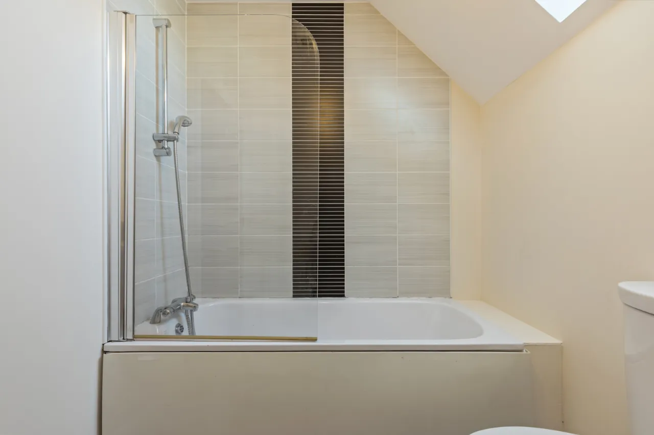 Comprising: Panelled bath with mixer taps , overhead shower with glass shower screen, low flush WC, wash hand basin with mixer taps and tiled splashback, extractor fan, tiled floor.