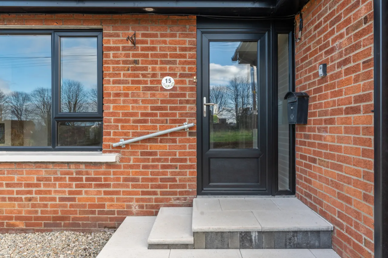 uPVC front door with glass inset and matching sidelight, leading through to reception hall.