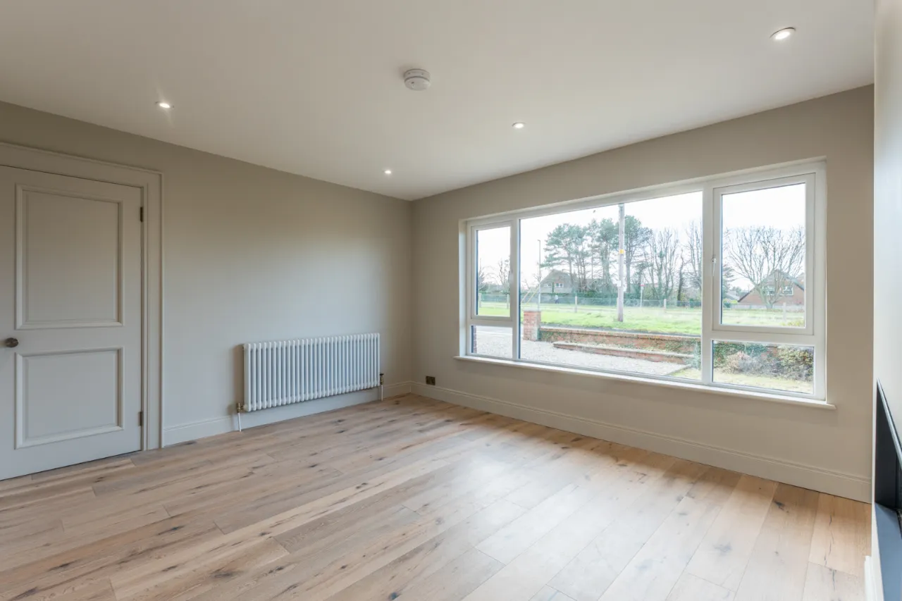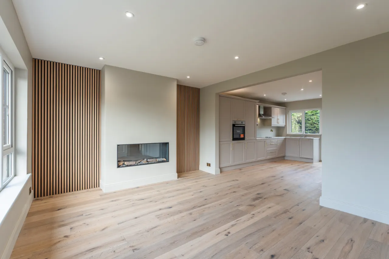 Outlook to front, recessed spotlighting, engineered wood effect flooring, electric fireplace, open to kitchen dining.
