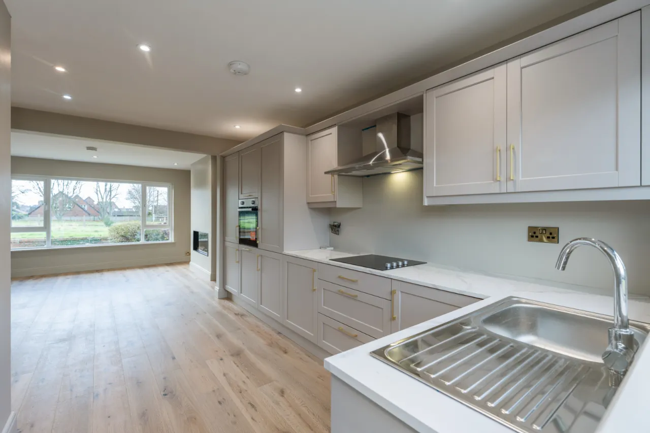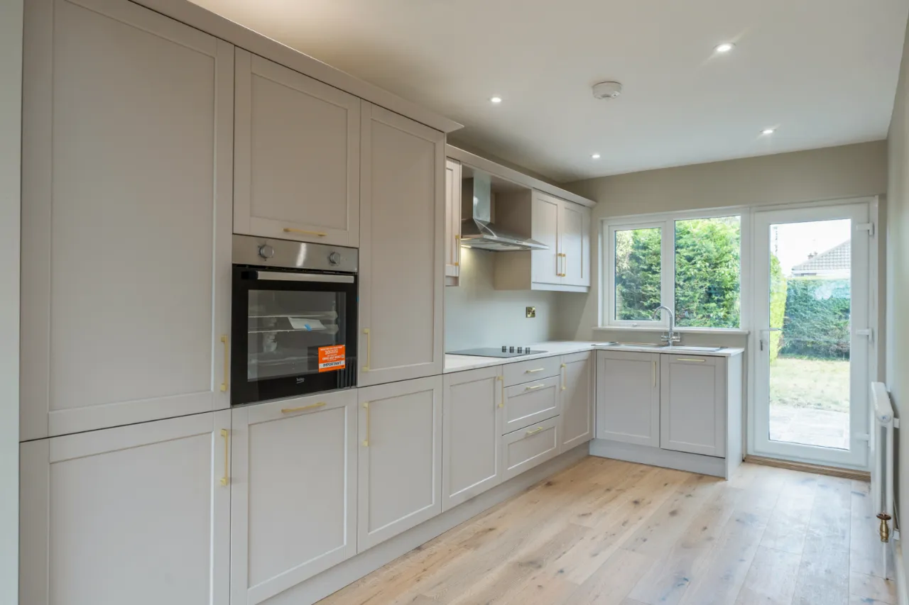 Fantastic range of high and low level units, Formica work surfaces with stainless steel sink unit and drainer 1 tub with mixer tap, integrated fridge freezer, integrated oven, four ring electric hob with stainless steel extractor fan, integrated dishwasher, engineered woof effect flooring, recessed spotlighting, access door through to rear garden.