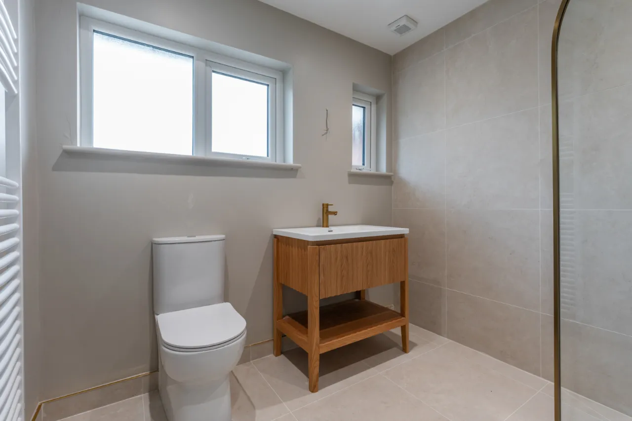 White suite comprising of low flush WC, wash hand basin with mixer tap, storage below, walk-in thermostatically controlled shower with rainfall shower head and handset, partly tiled walls, tiled flooring, recessed spotlighting, vertical chrome heated towel rail, extractor fan.