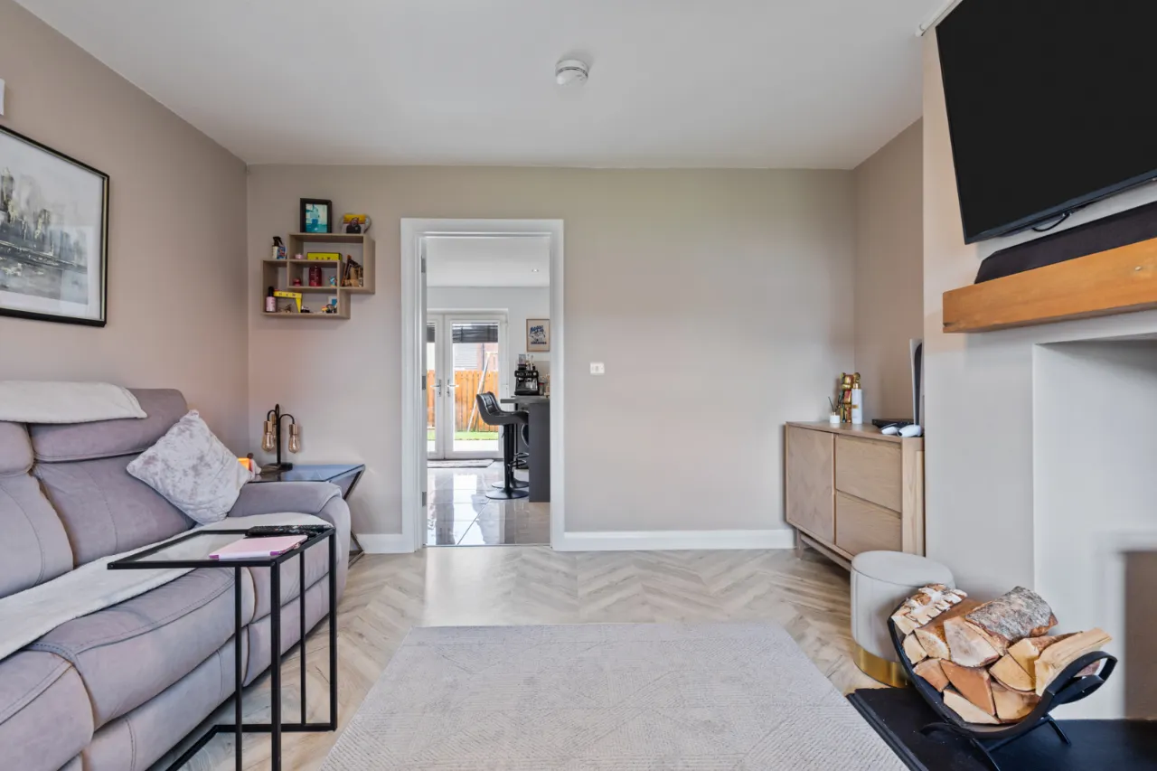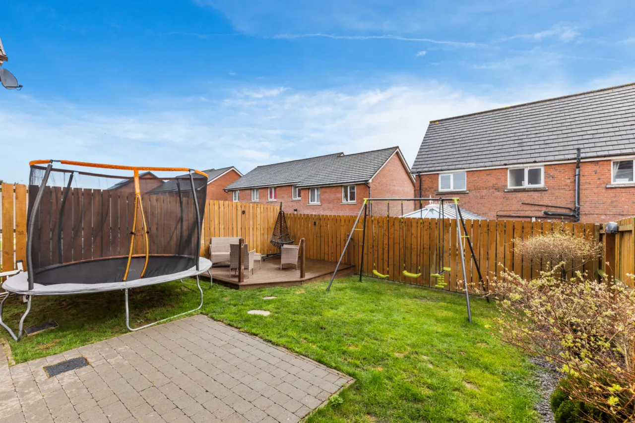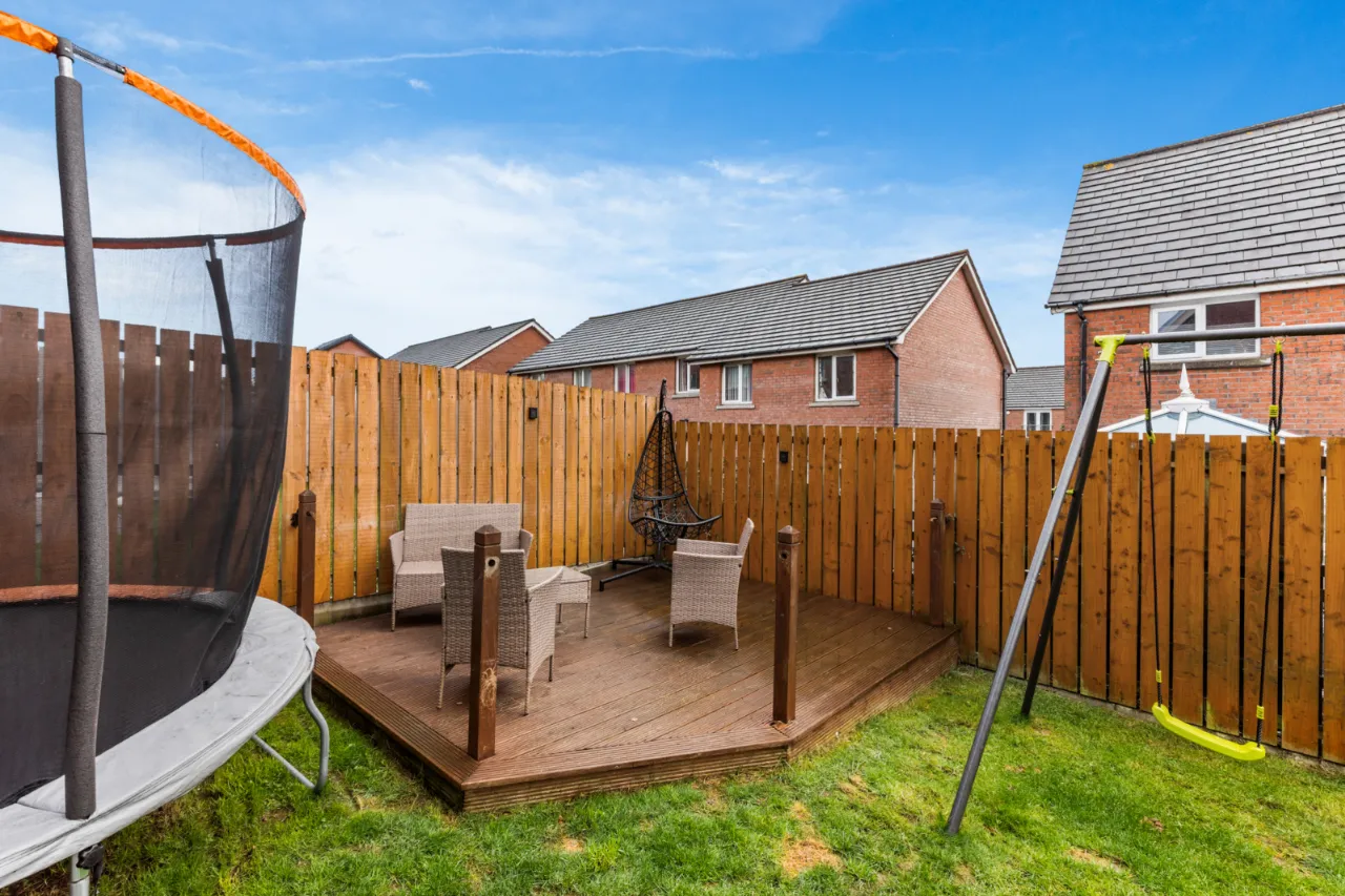 Front garden in lawn, enclosed rear garden in lawn with decked area and paved patio area, outside tap, outside light. Driveway parking for 2 cars.
