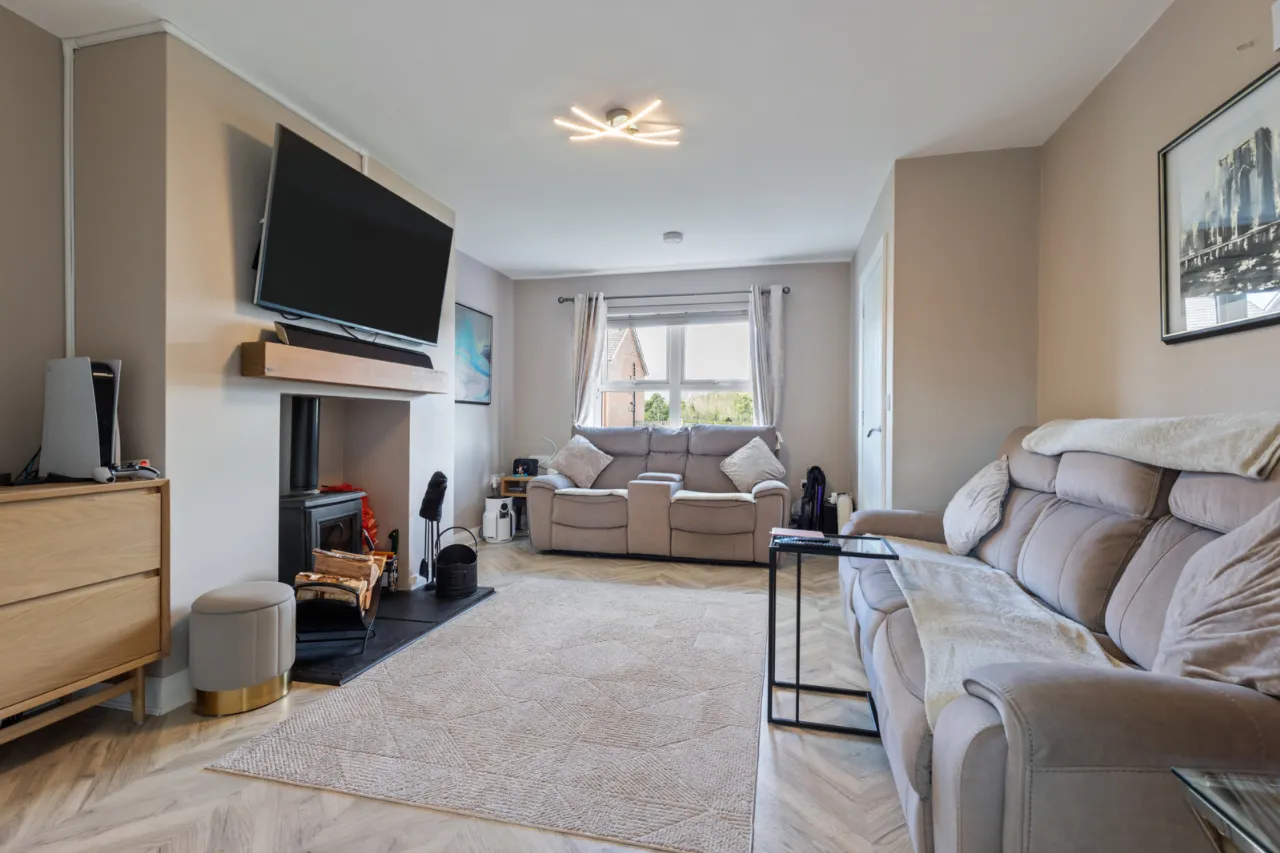 Cast iron multi fuel burning stove, sleeper mantle, laminate wooden flooring.
