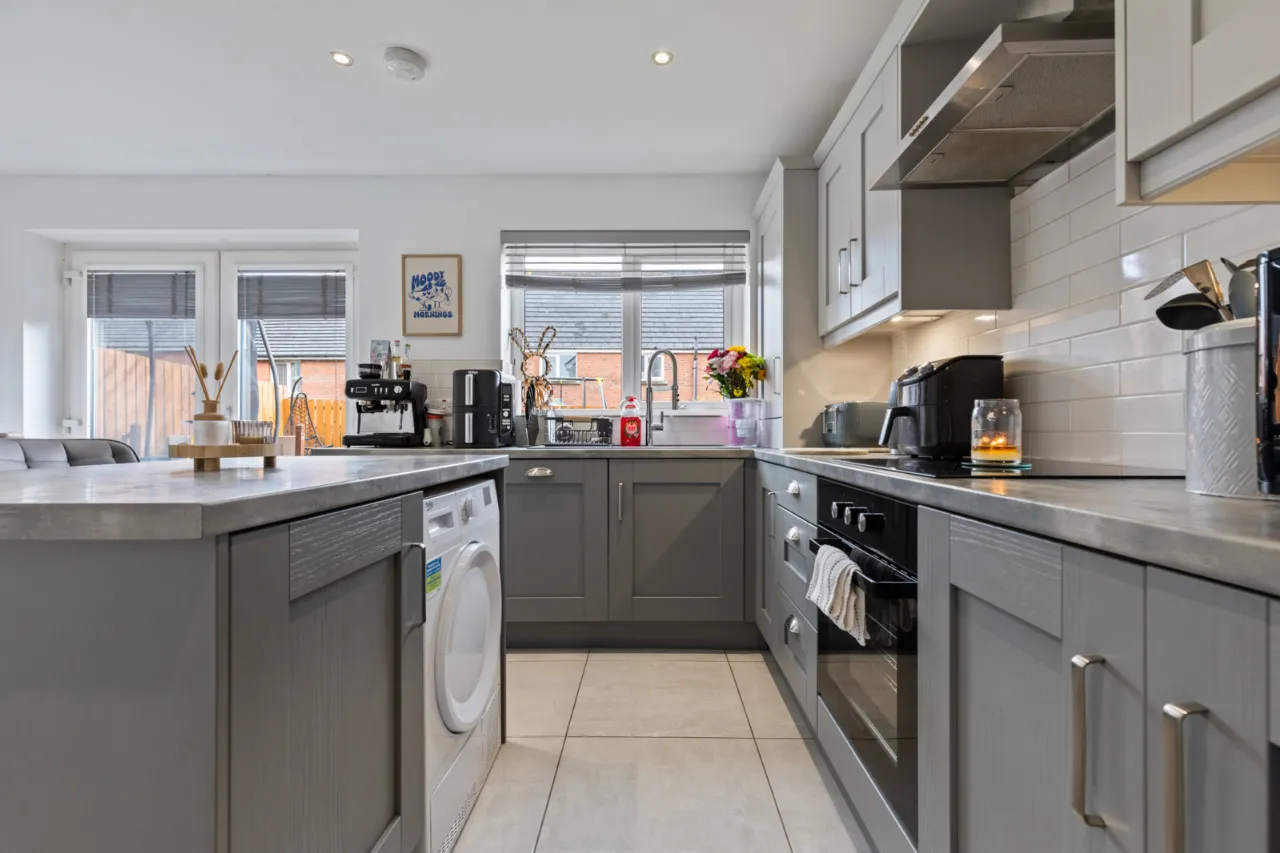 Excellent range of high and low level shaker style units, laminate wooden work surfaces, Island with breakfast bar, 1 1/4 bowl sink unit with chrome mixer taps, plumbed for washing machine, space for tumble dryer, concealed gas fired boiler, integrated electric under oven, 4 ring ceramic hob, integrated fridge freezer, space for dining, uPVC double glazed French door to garden, partly tiled walls, ceramic tiled floor.