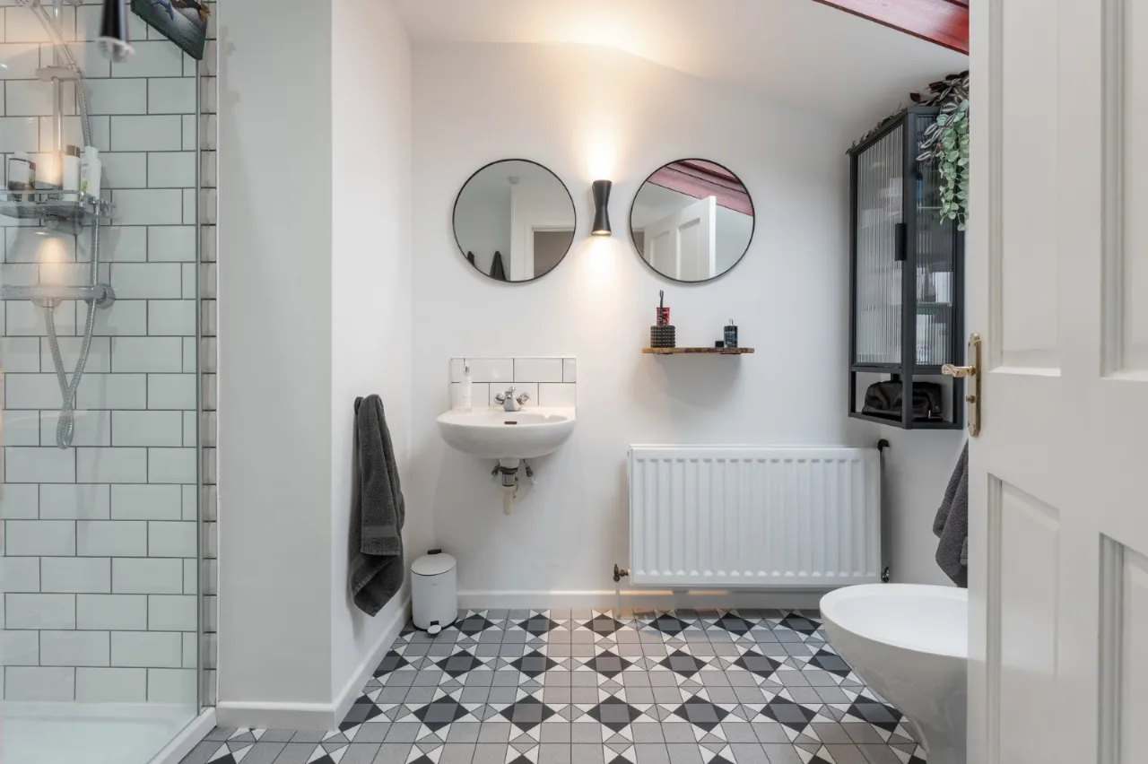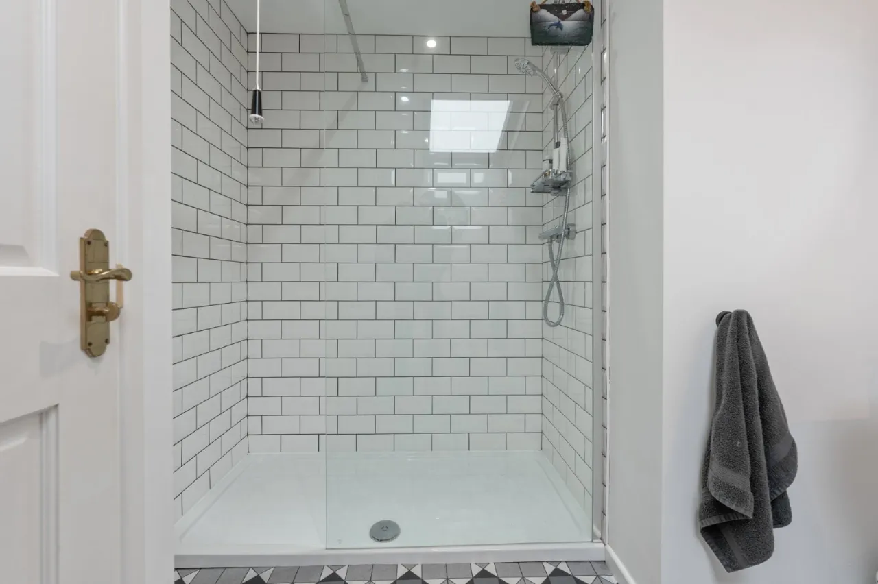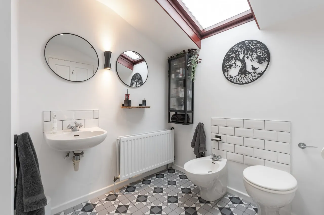 Walk in shower cubicle with chrome thermostatic shower unit, wash hand basin with chrome mixer taps and tiled splashback, concealed cistern WC, bidet, velux window.
