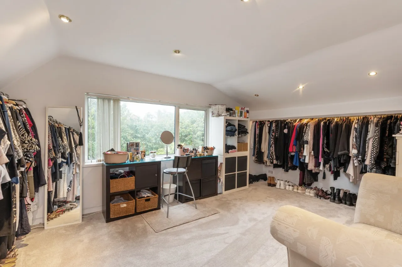 Laminate wooden floor, storage into eaves, velux window. Hotpress with lagged copper cylinder, built in storage.