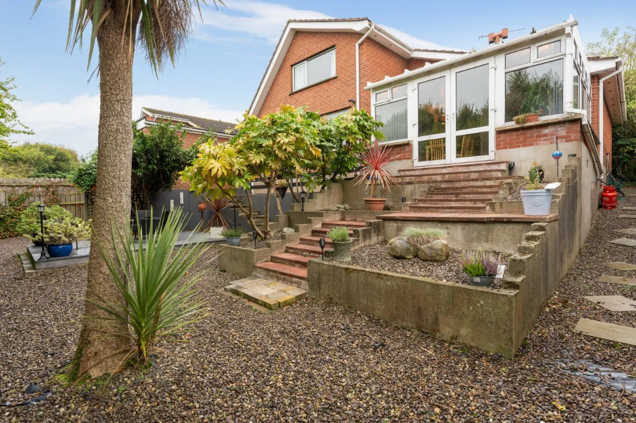 Low maintenance front and rear garden in loose pebbles, decked and paved patio areas, outside light. PVC oil tank. Mature hedges and trees. Tarmac driveway with parking for 3 cars.