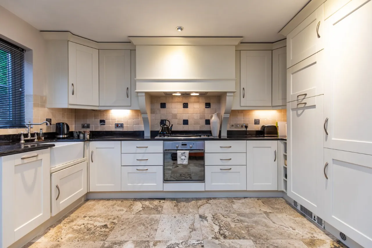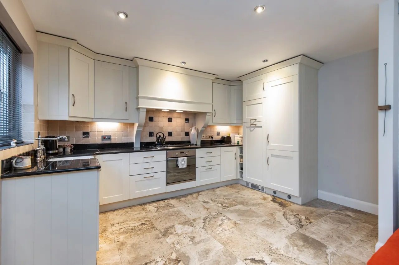 Range of high and low level shaker style units, granite work surfaces and upstands, ceramic inset sink unit with mixer taps, integrated fridge and freezer, integrated electric oven, 3 ring gas hob and electric grill pad, concealed extractor fan, ceramic tiled floor, composite door to patio and garden. Ample space for dining or living.
