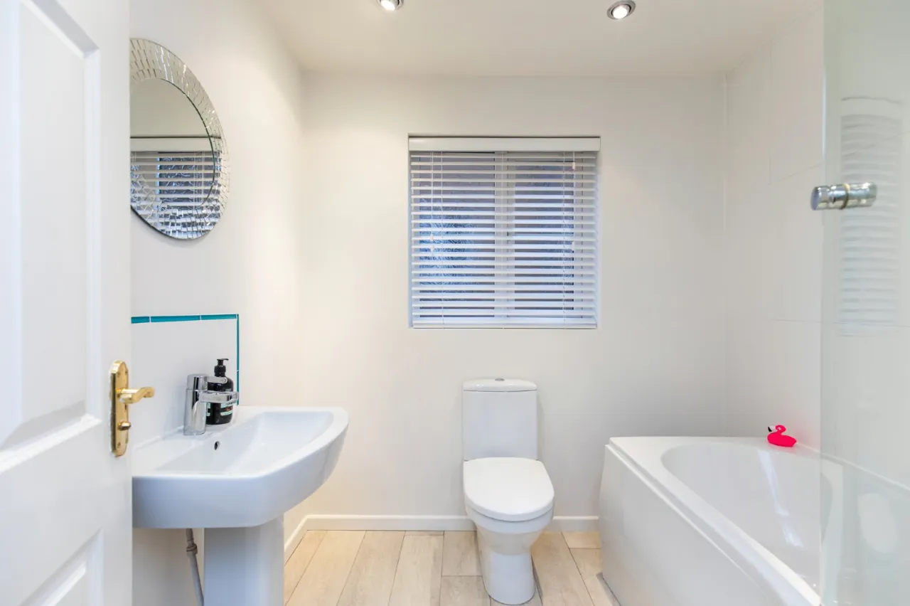 White suite comprising: Shower bath with electric shower over, glass shower screen, low flush WC, pedestal wash hand basin with chrome mixer taps and splashback, ceramic tiled floor, partly tiled walls, extractor fan.