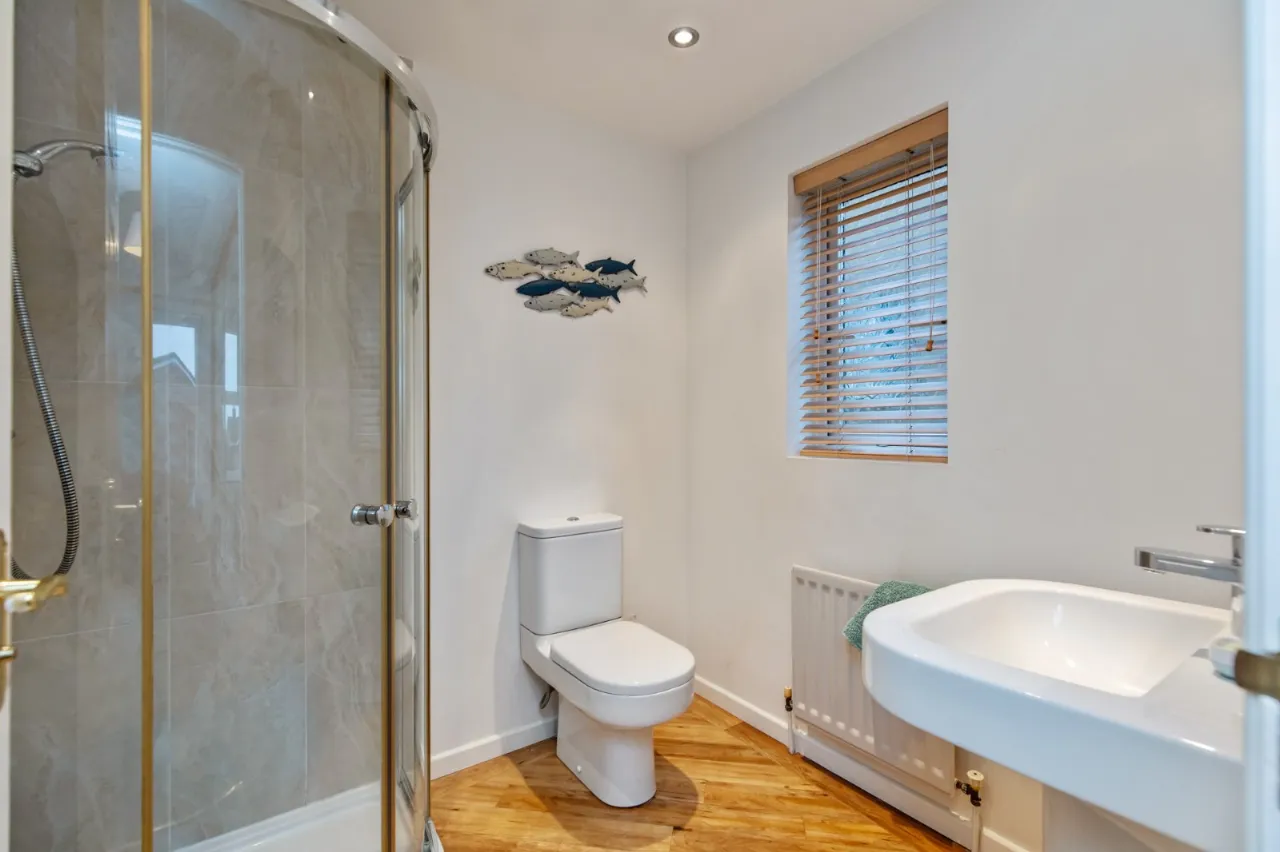 Corner fully tiled shower cubicle, power shower, pedestal wash hand basin, low flush WC, extractor fan, low voltage spotlighting.