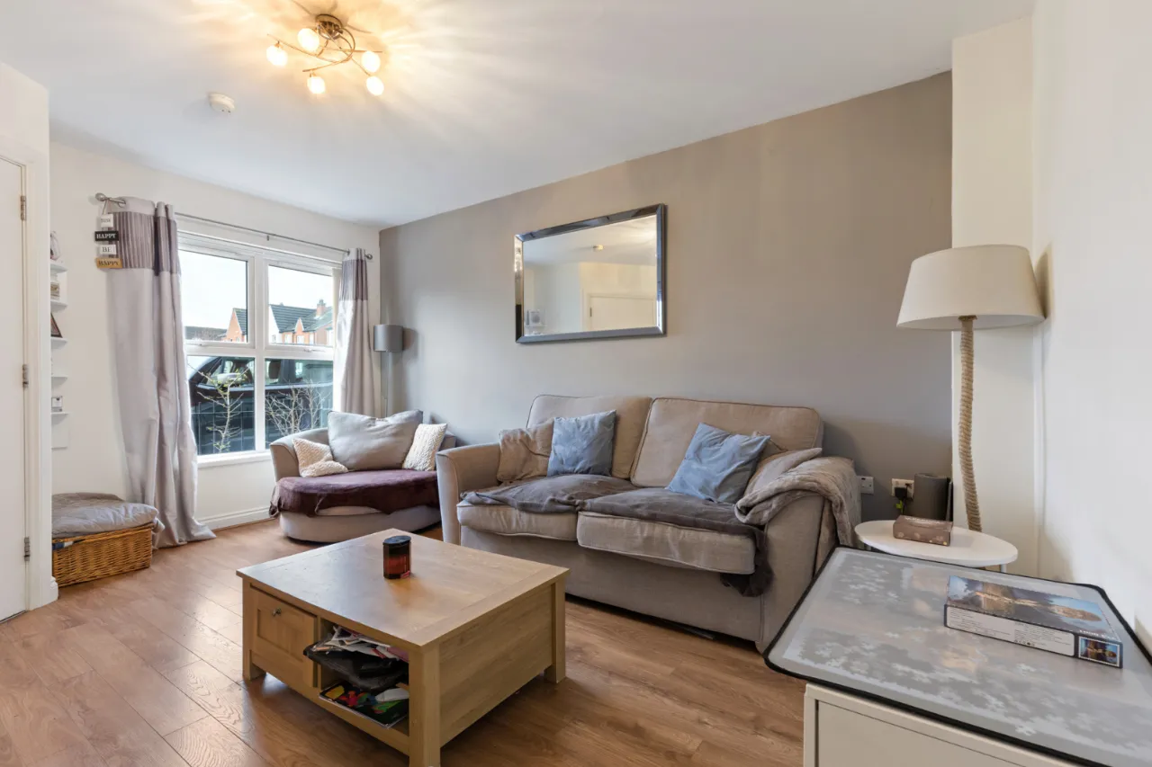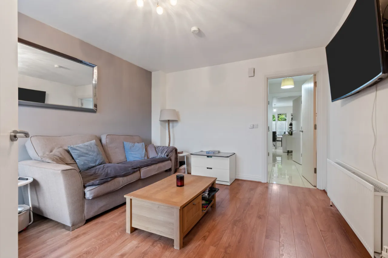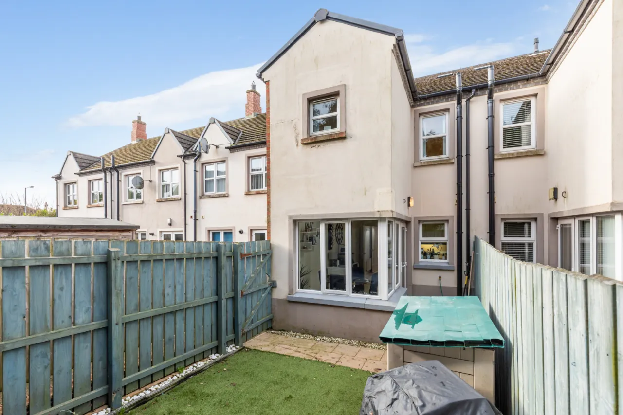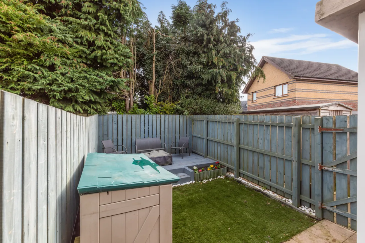 Fully enclosed, low maintenance rear garden with artificial grass and raised decked patio area, outside tap, outside light.