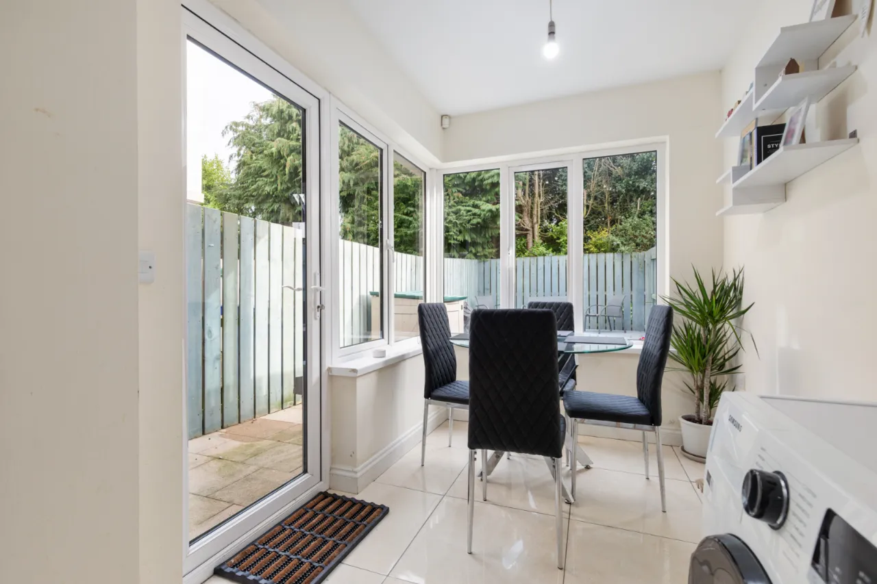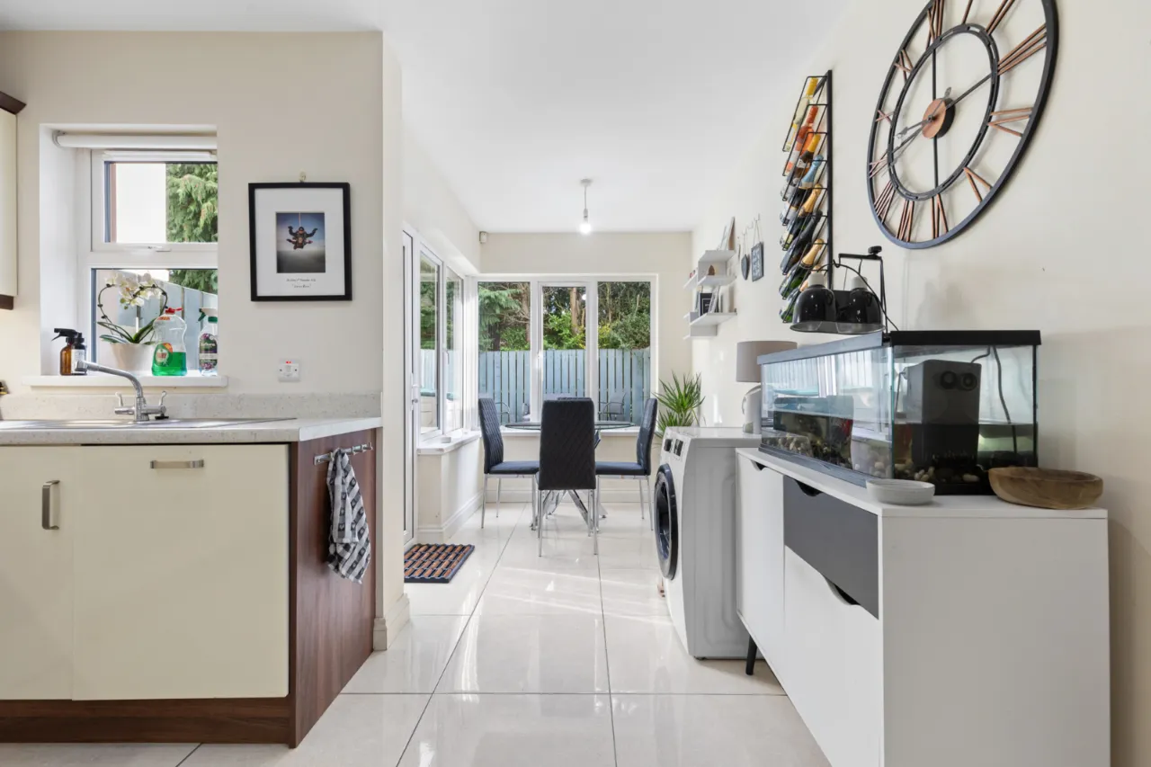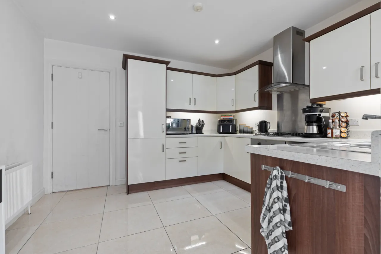 Excellent range of high and low level units, laminate work surfaces, single drainer stainless steel 1 1/4 bowl sink unit with chrome mixer taps. Integrated electric under oven, 4 ring gas hob, stainless steel splashback, extractor fan, integrated fridge and freezer, plumbed for washing machine, ceramic tiled floor, integrated dishwasher, low voltage spotlights, uPVC double glazed door to enclosed rear garden.