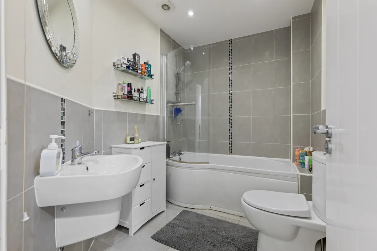White suite comprising: Wash hand basin with chrome mixer taps shower bath with chrome mixer taps and telephone hand shower, low flush WC, partly tiled walls, ceramic tiled floor, extractor fan, low voltage spotlights.