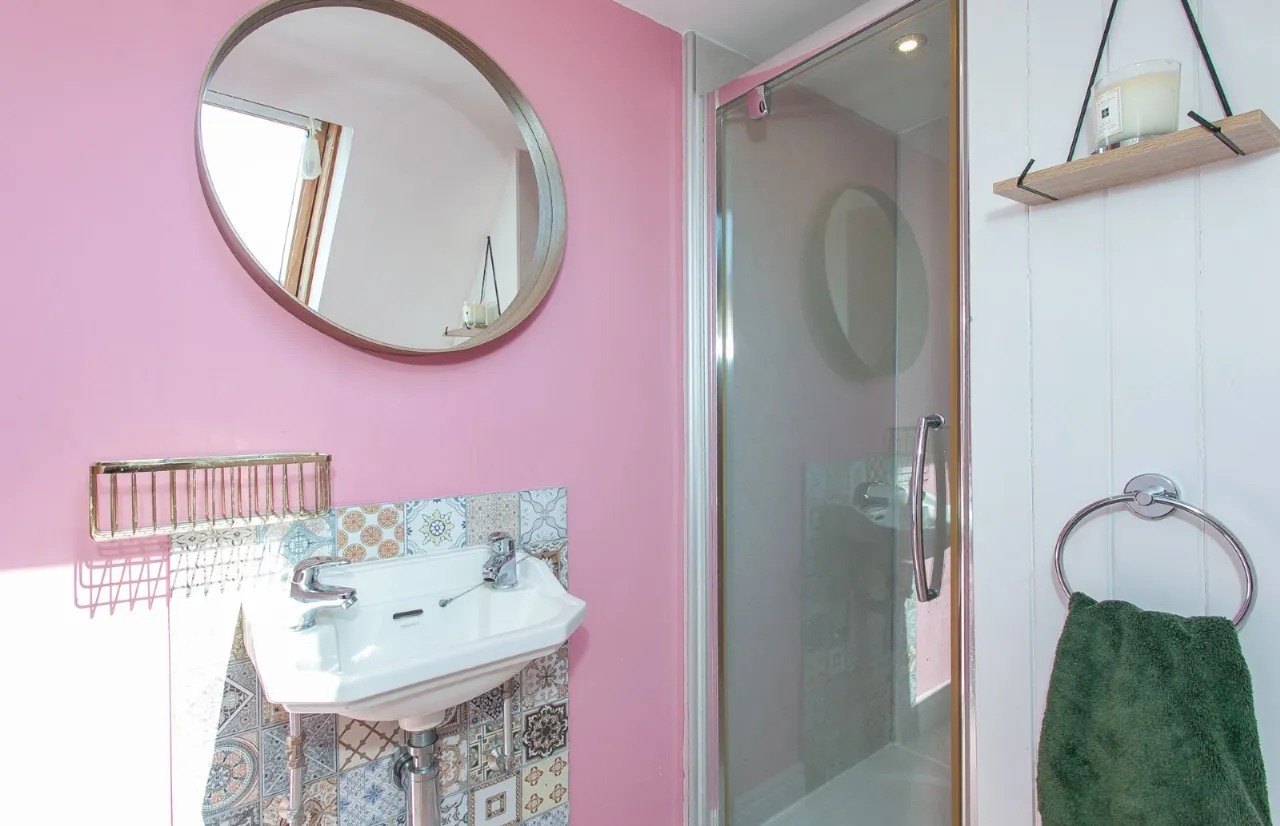 Fully panelled shower enclosure, Low flush WC. Wash hand basin. Hotpress.