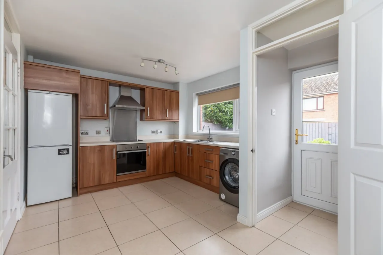Range of high and low level units, laminate work surface with stainless steel sink unit and drainer, 1.5 tub with mixer tap. Integrated oven, four ring electric hob, stainless steel kitchen splash back with stainless steel extractor above, space for fridge freezer, plumbed for washing machine, space for tumble dryer, tiled flooring, open to dining area, access to rear hall.