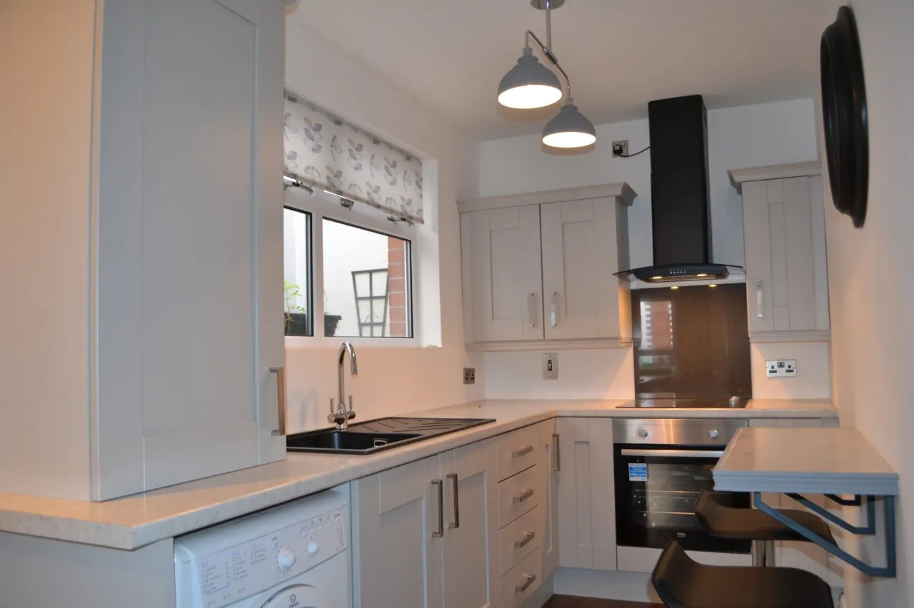 Modern fitted kitchen with high and low level units, work surfaces, sink unit and mixer taps, integrated four ring electric hob, oven and extractor hood, plumbed for washing machine, gas boiler, matching flooring.
