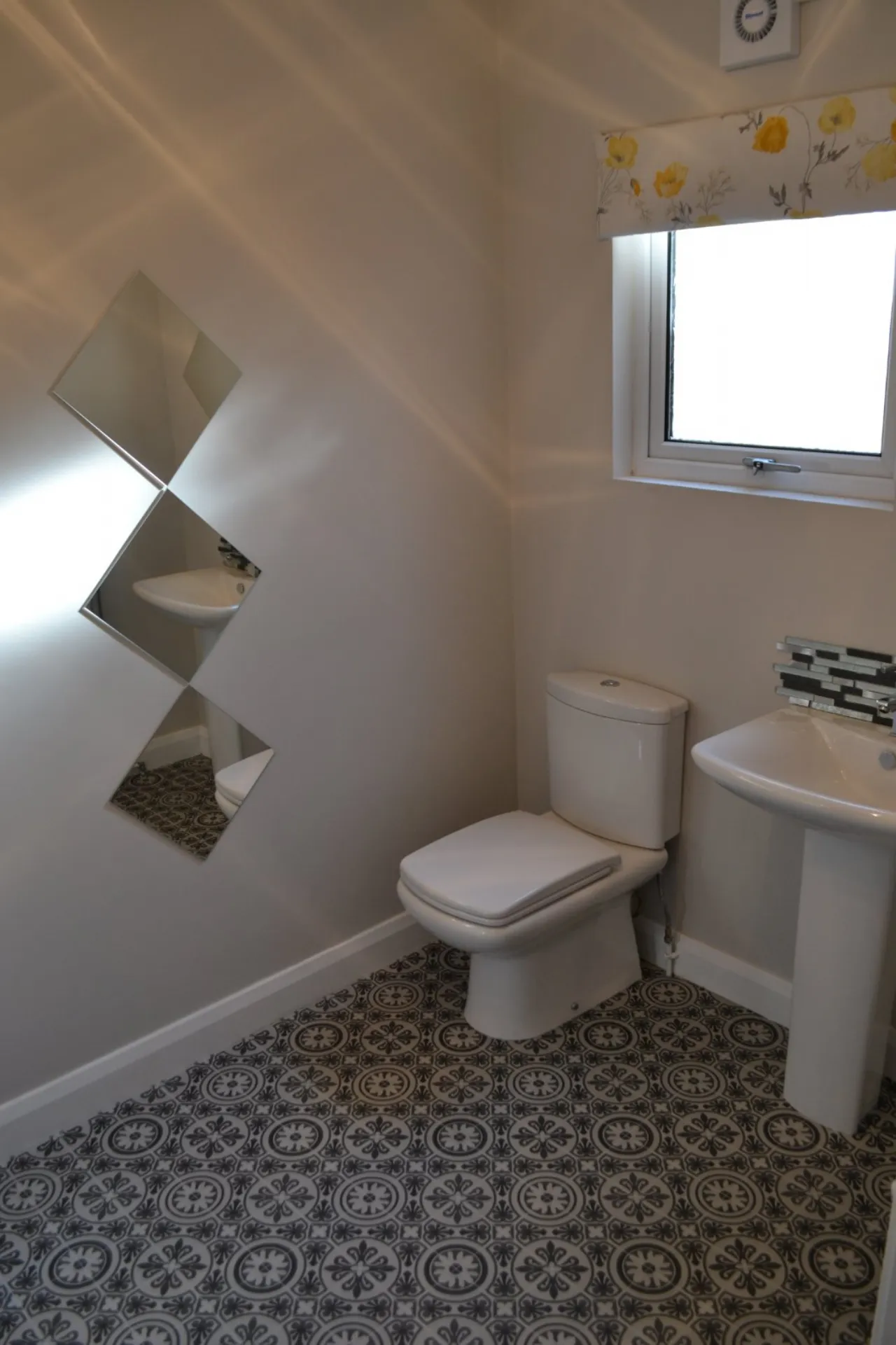 White suite comprising WC, wash hand basin, double shower tray, heated towel rail and extractor fan