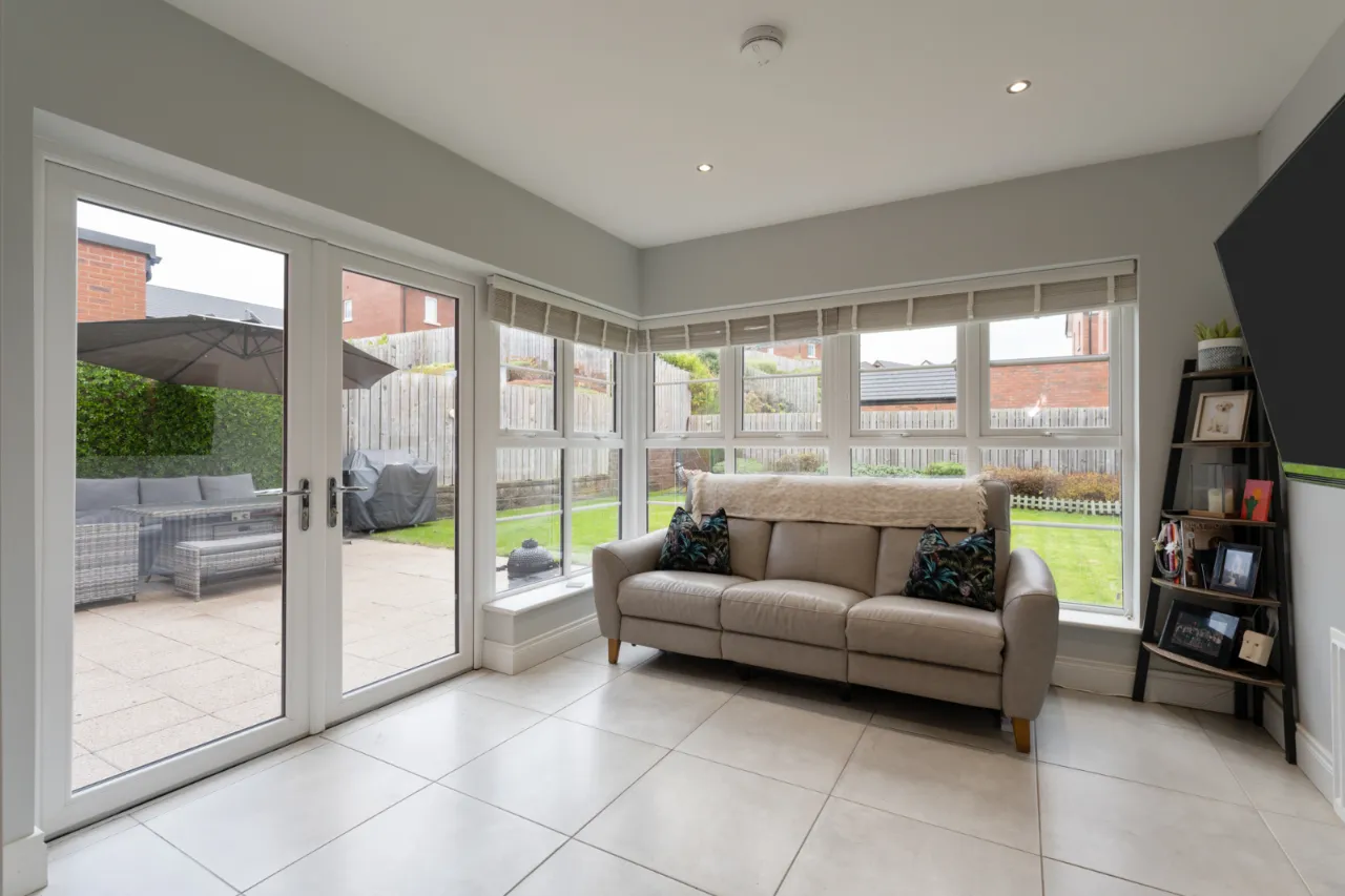 Tiled flooring, recessed spotlighting, outlook to rear, uPVC double French doors leading through to rear garden.