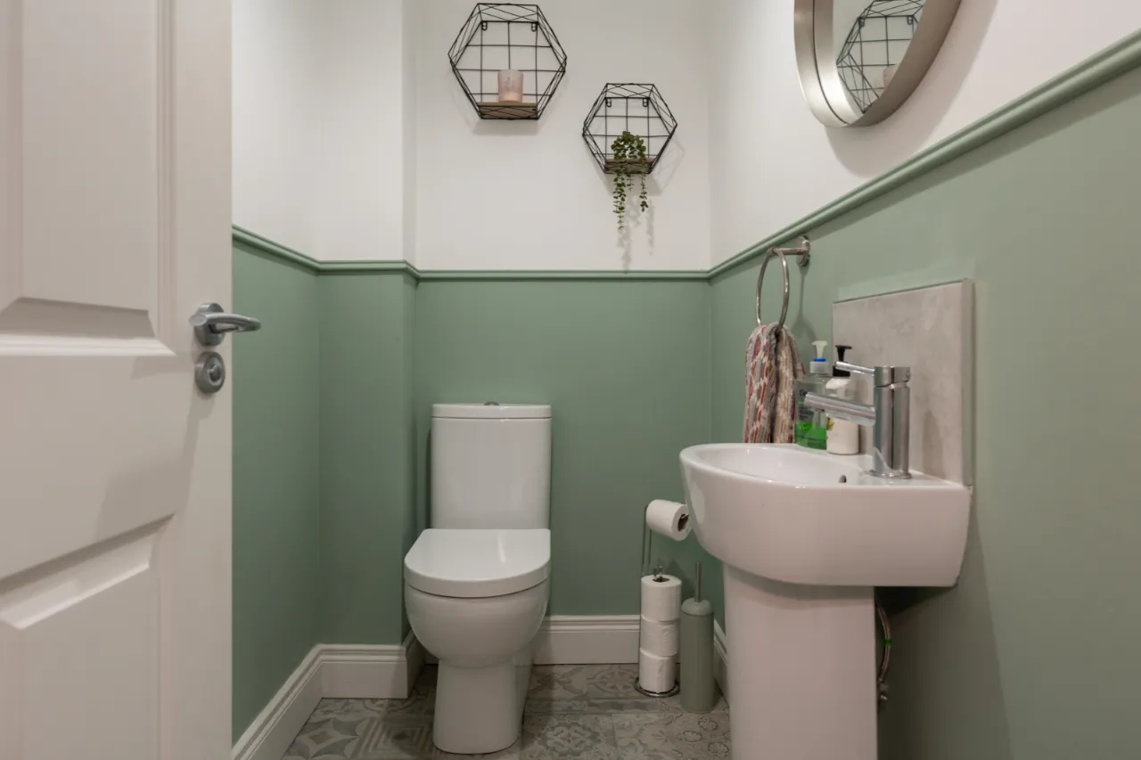 White suite comprising of low flush WC, pedestal wash hand basin with mixer tap and tiled splash back, tiled flooring.