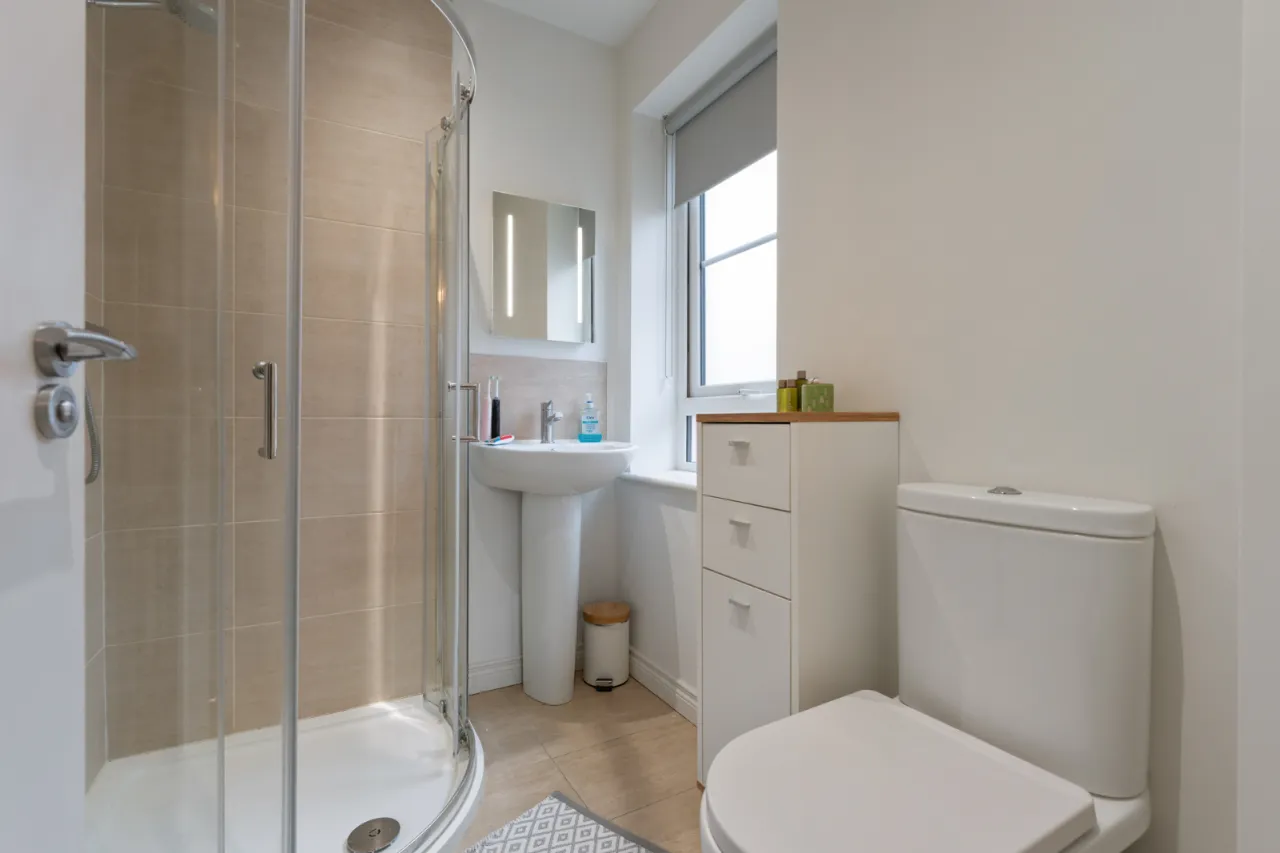 White suite comprising of low flush WC, pedestal wash hand basin with mixer tap, tiled splash back, walk-in thermostatically controlled shower with handset, partly tiled walls, tied flooring, recessed spotlighting, extractor fan, vertical chrome heated towel rail.