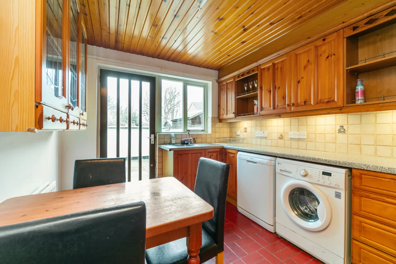 Full range of high and low level units, stainless steel single drainer sink unit with mixer taps, plumbed for washing machine, 4 ring hob, eye level oven, partly tiled walls, ceramic tiled floor.
