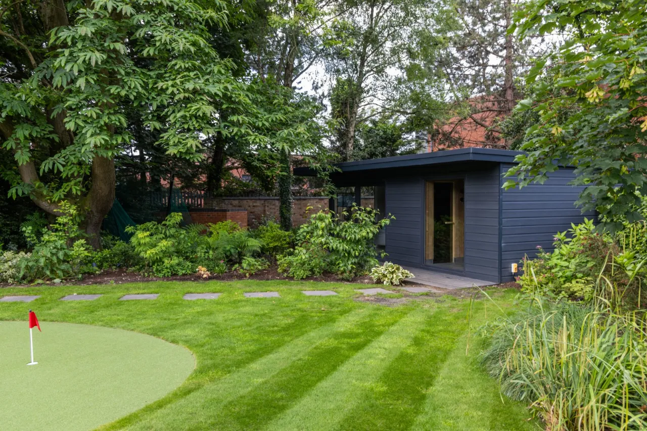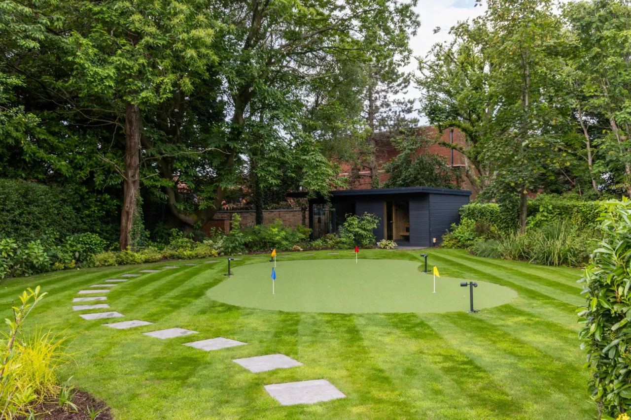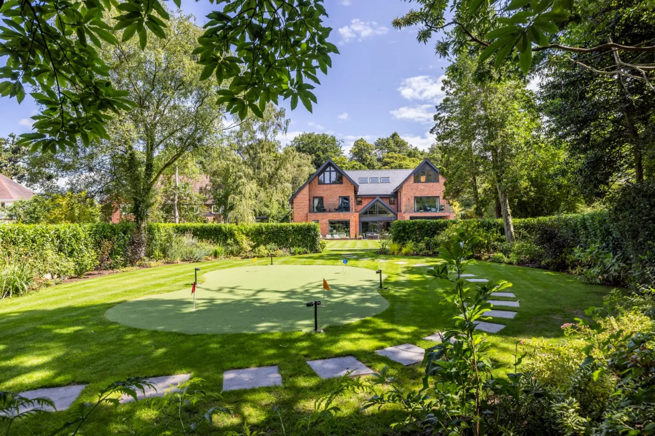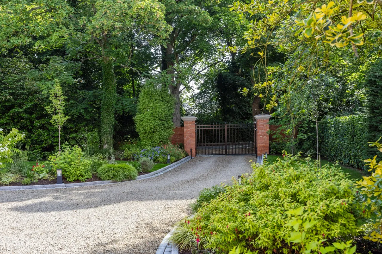 Granite tiles with access points to left and right of front driveway, wide enough for car and trailer down left hand side with double entrance gates, footlighting, mature hedging and stoned garden areas which leads to a large back terrace which has a fantastic entertaining space off the kitchen. Sliding door that opens to outside living room with lighting, fully glazed gas fire overlooking rear gardens and there is also an enclosed BBQ area leading to concertina windows that lead into entertaining area inside. Plumbed for sink, water provision, large built in area for BBQ, gas fire, outside lighting, outside speakers which leads into party room inside. Outside dining space with footlighting, built in half wall with power points. Sun areas in front of the living/dining/kitchen. Steps up to large level lawn which has easy access to hot tub with built in speakers and footlighting. Surrounding the lawn are colourful flowerbeds, specimen trees and hedges which gives privacy. Properly treated grass. Pathway amongst the lawn leading to all weather astroturf. Lighting amongst trees leading to wellness centre/home office with wood effect floor, sliding doors to front and window to side, heating, power door to low flush wc, glazed door leading to sauna overlooking rear gardens and putting green. Garden tool shed / storage to the rear.