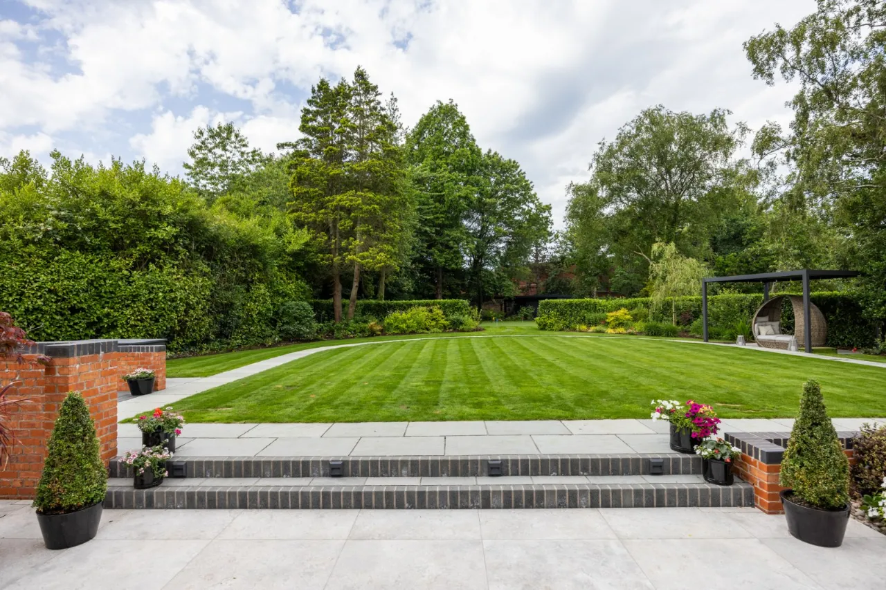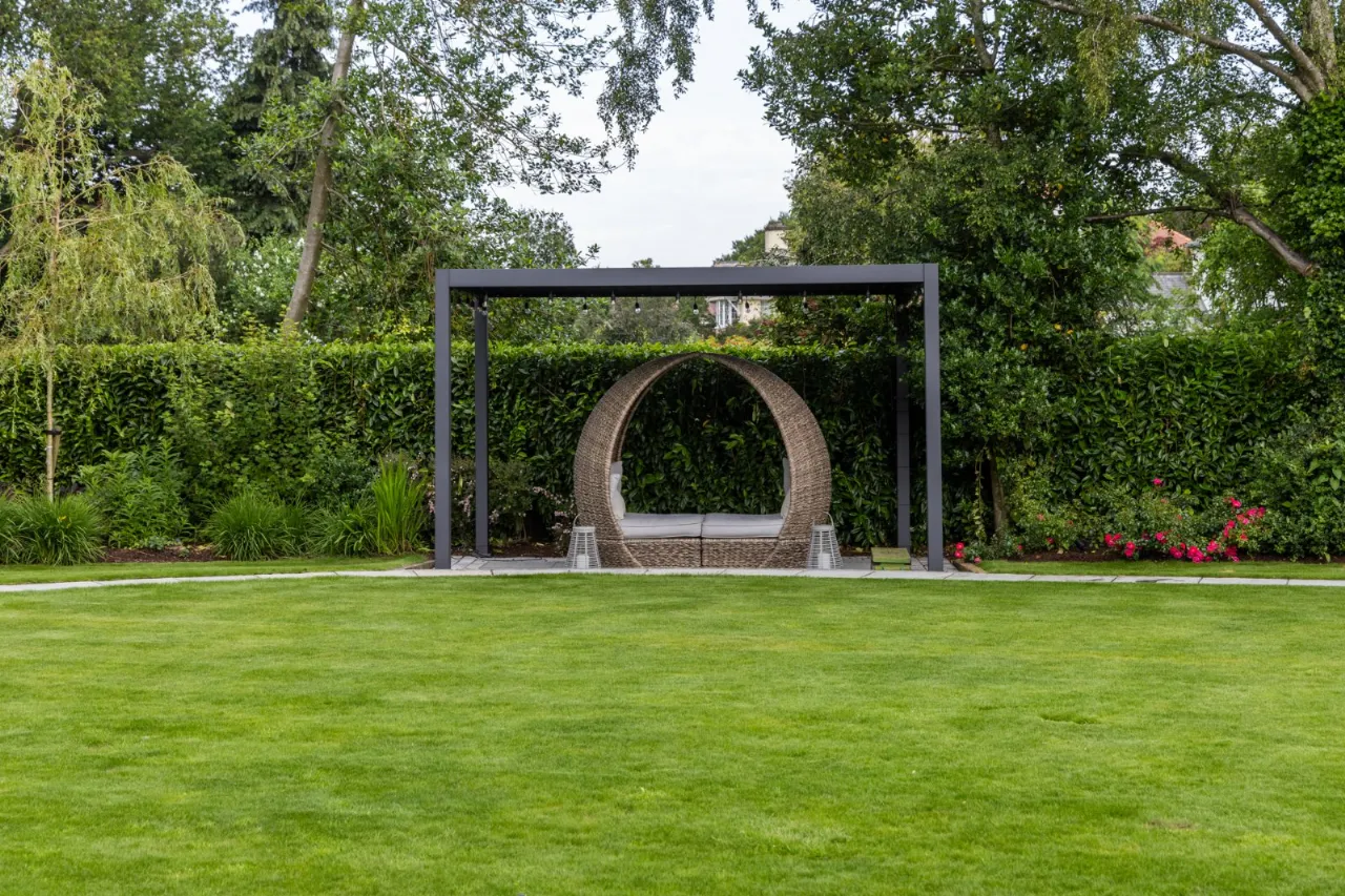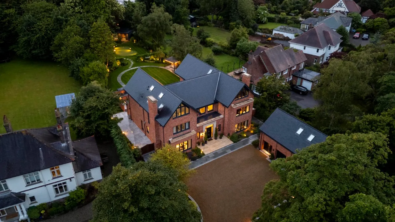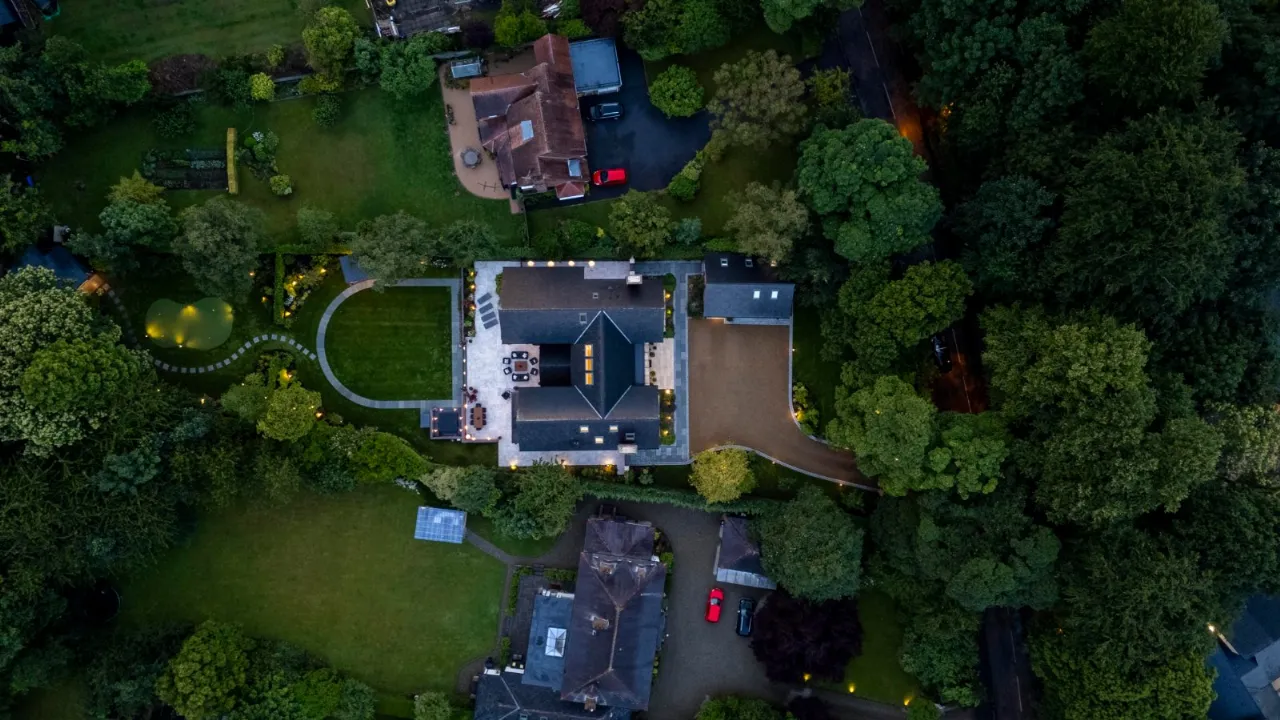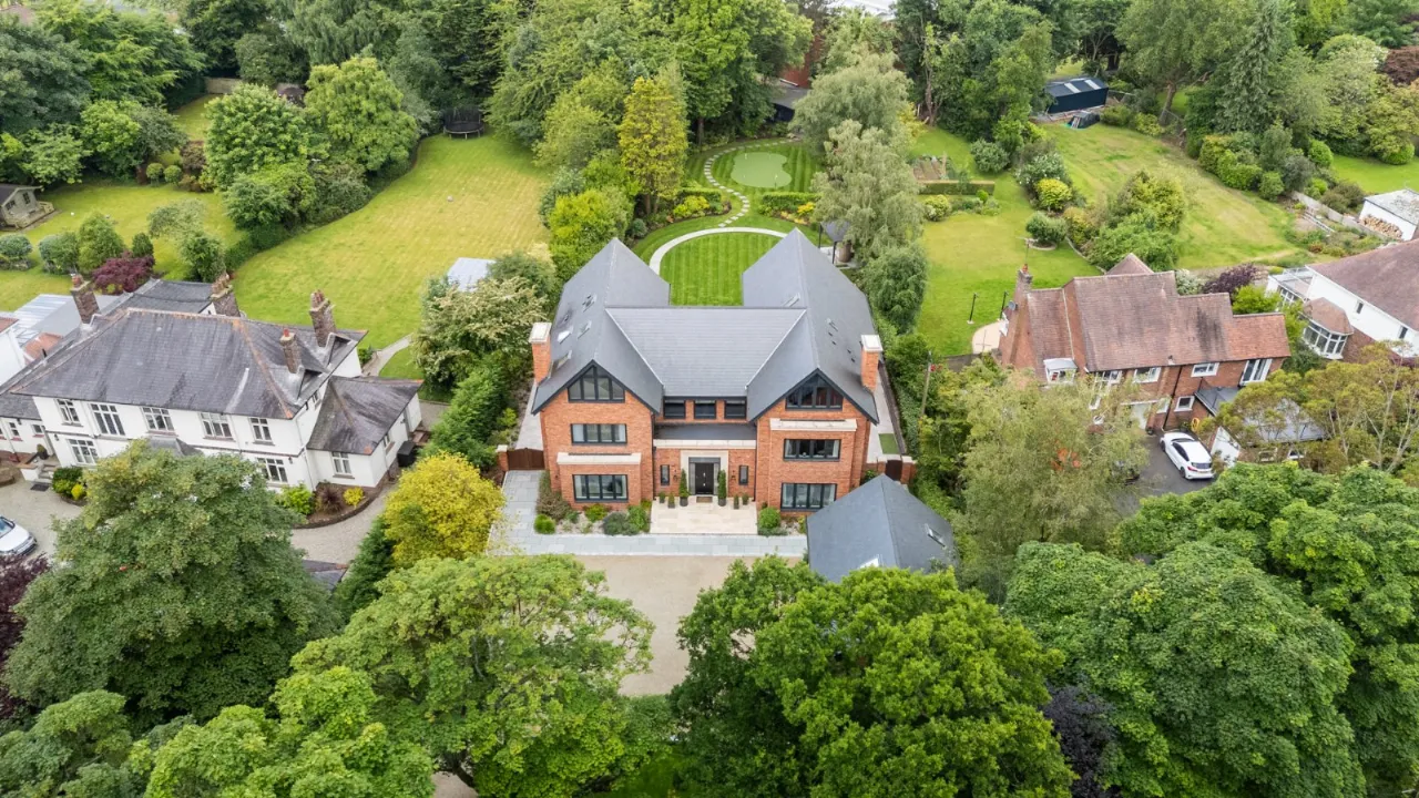 Granite tiles with access points to left and right of front driveway, wide enough for car and trailer down left hand side with double entrance gates, footlighting, mature hedging and stoned garden areas which leads to a large back terrace which has a fantastic entertaining space off the kitchen. Sliding door that opens to outside living room with lighting, fully glazed gas fire overlooking rear gardens and there is also an enclosed BBQ area leading to concertina windows that lead into entertaining area inside. Plumbed for sink, water provision, large built in area for BBQ, gas fire, outside lighting, outside speakers which leads into party room inside. Outside dining space with footlighting, built in half wall with power points. Sun areas in front of the living/dining/kitchen. Steps up to large level lawn which has easy access to hot tub with built in speakers and footlighting. Surrounding the lawn are colourful flowerbeds, specimen trees and hedges which gives privacy. Properly treated grass. Pathway amongst the lawn leading to all weather astroturf. Lighting amongst trees leading to wellness centre/home office with wood effect floor, sliding doors to front and window to side, heating, power door to low flush wc, glazed door leading to sauna overlooking rear gardens and putting green. Garden tool shed / storage to the rear.