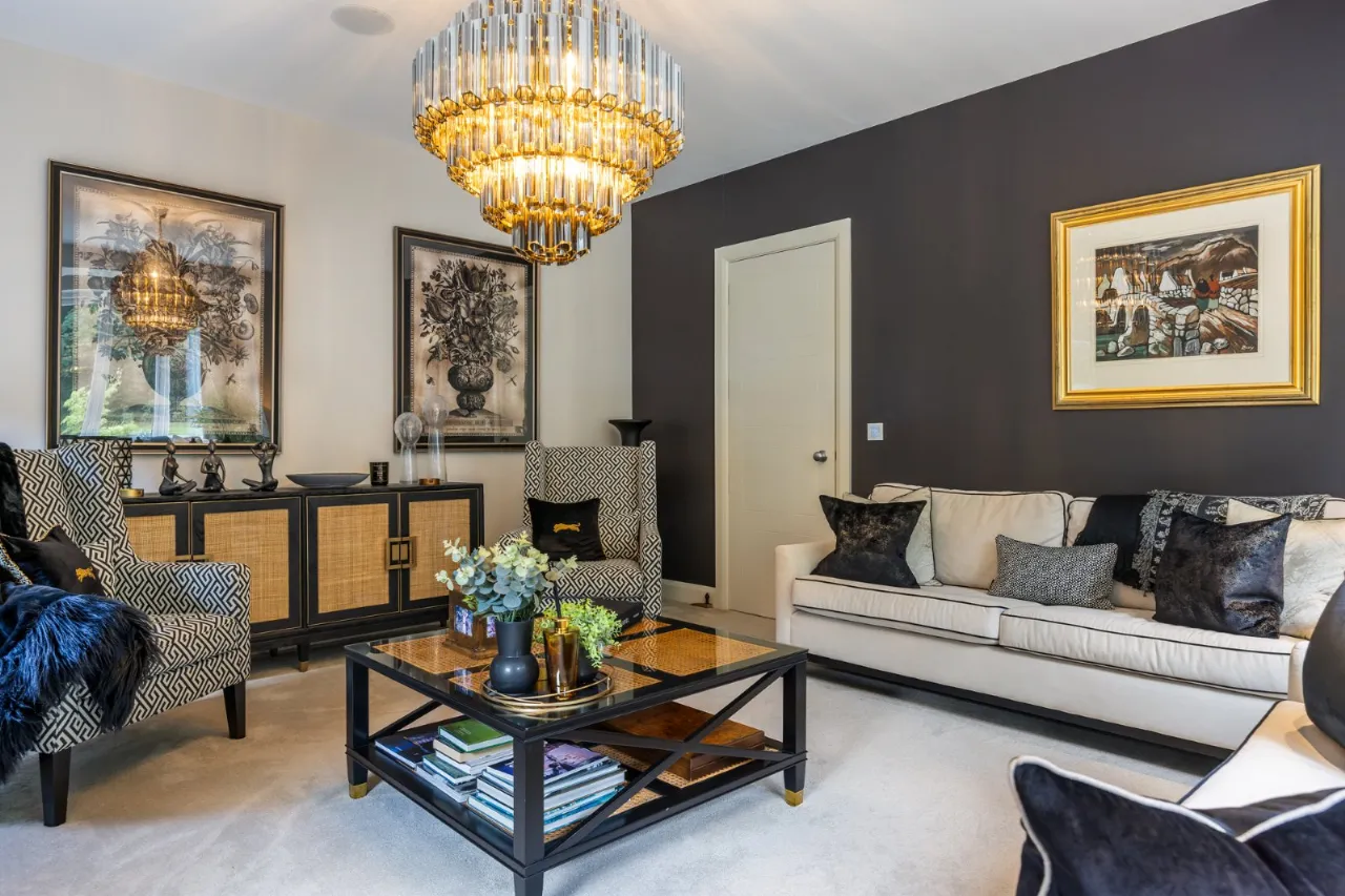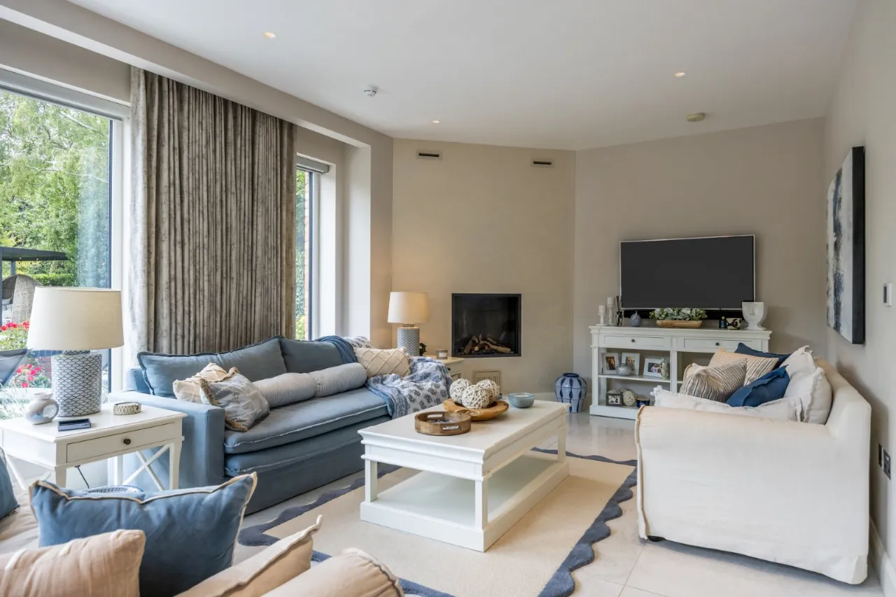 Windows to front and two windows to each side of the central fireplace with long gas fire with polished granite worktop and built in sideboard. Windows to front with concealed pelmet, curtains and feature lighting, wired for Sonos.
