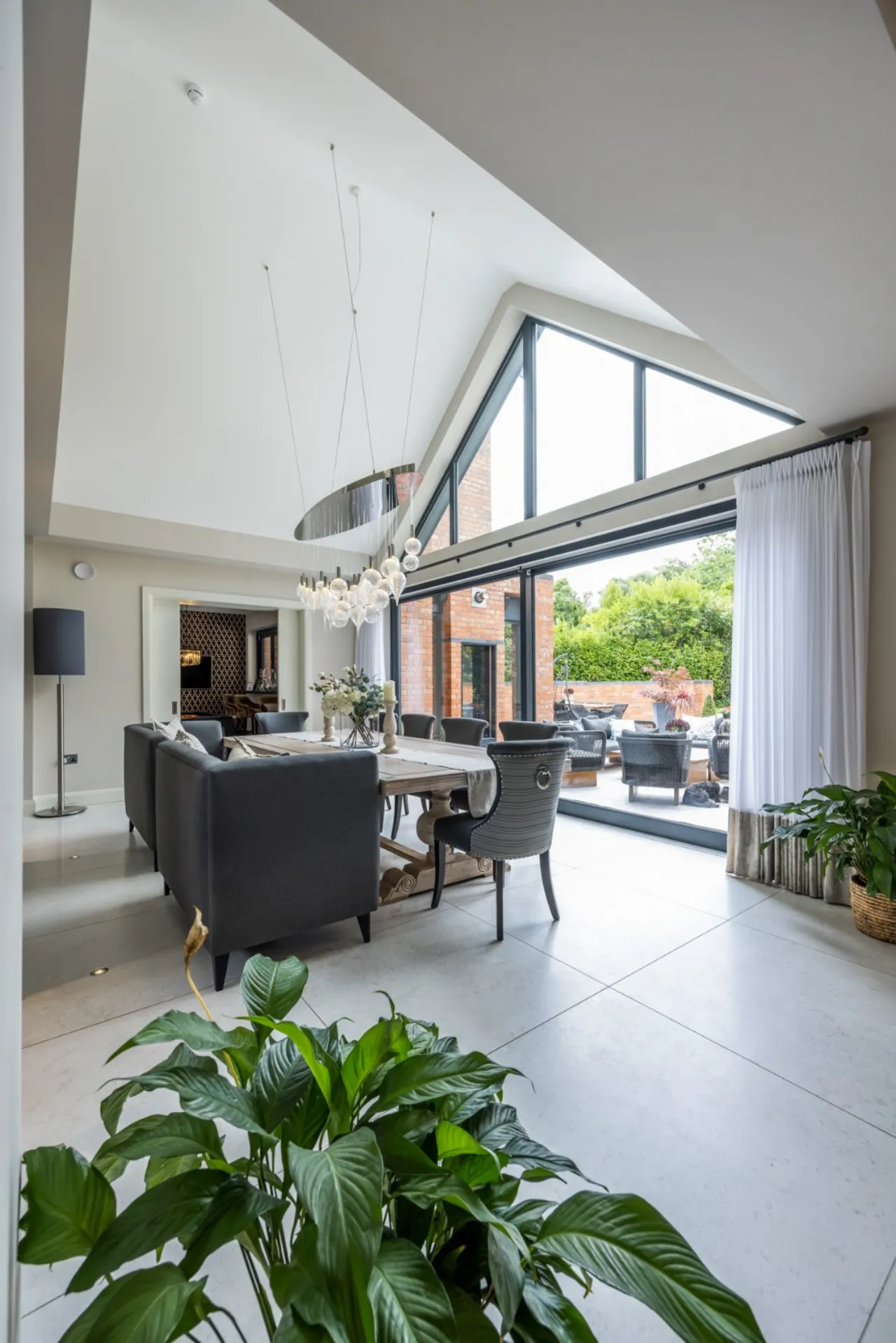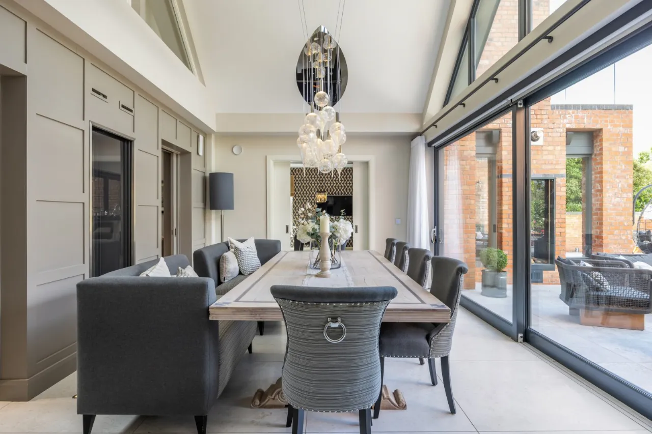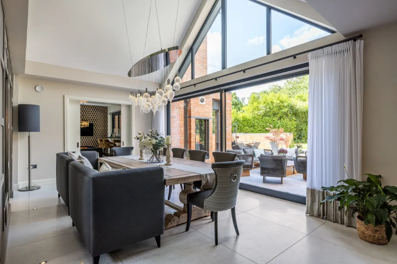 Tiled floor, double height ceiling with feature triangular eaves windows. Wired for Sonos. Automated window blinds. Space for 12-14 seater dining table and chairs, a large glazed sliding door which leads to entertaining patio which overlooks the rear gardens and BBQ area.