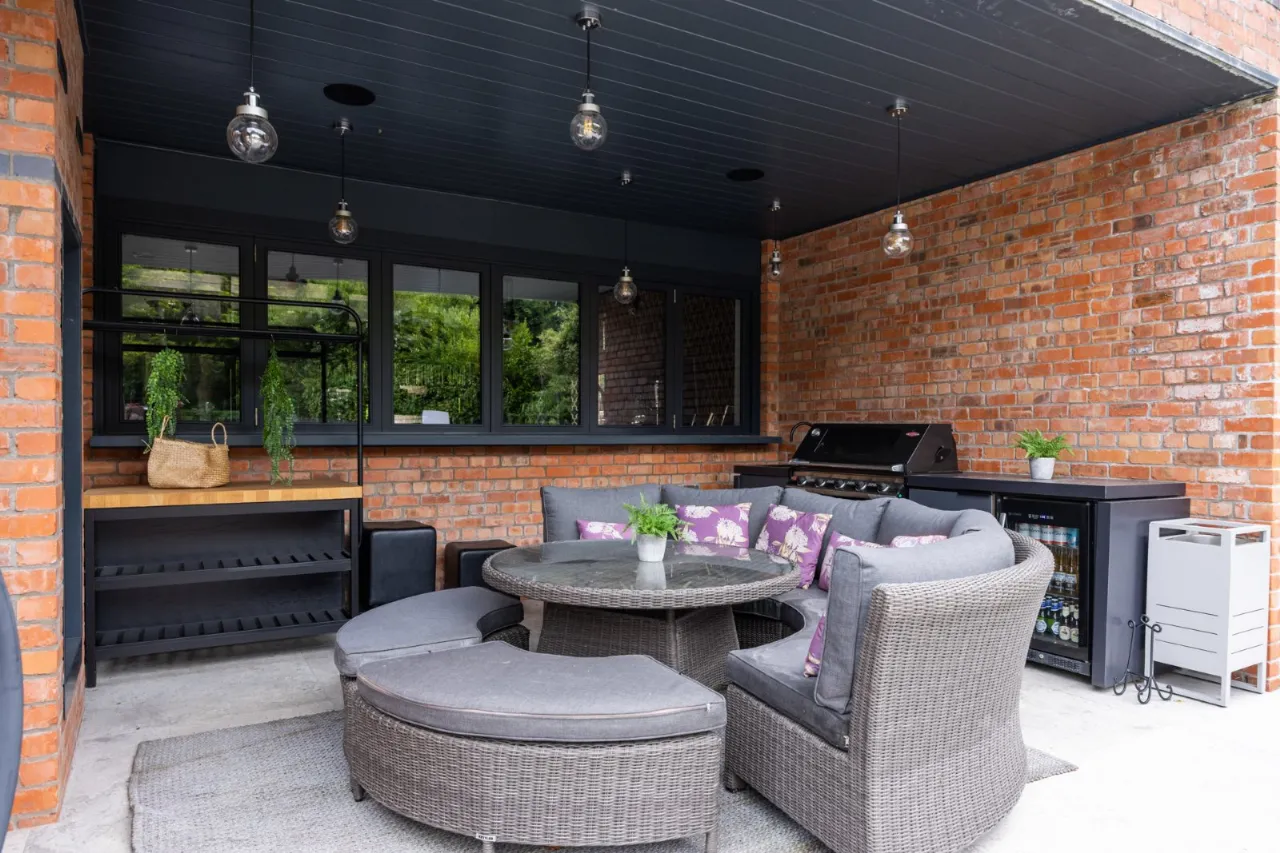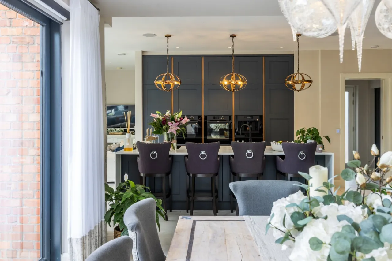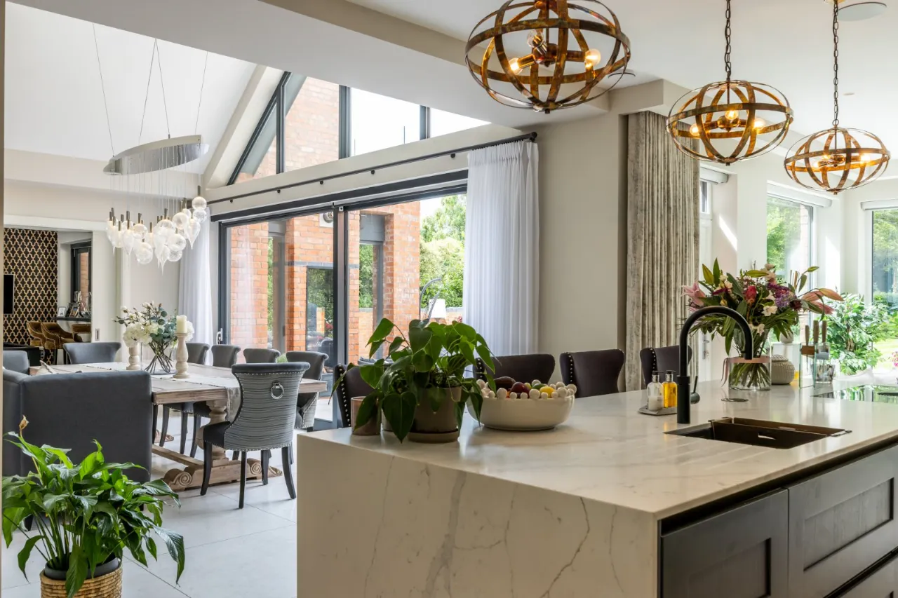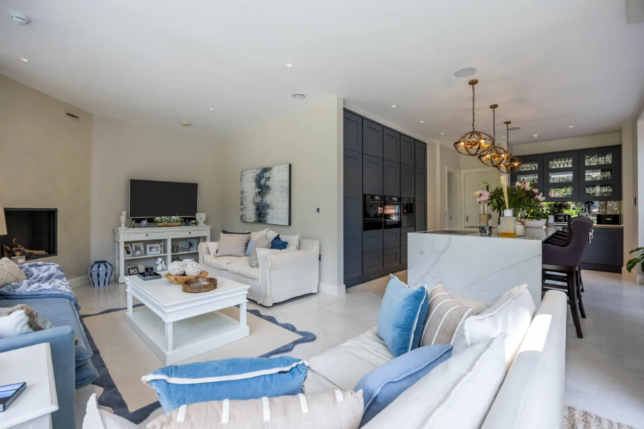 Tiled floor, double height ceiling with feature triangular eaves windows. Wired for Sonos. Automated window blinds. Space for 12-14 seater dining table and chairs, a large glazed sliding door which leads to entertaining patio which overlooks the rear gardens and BBQ area.