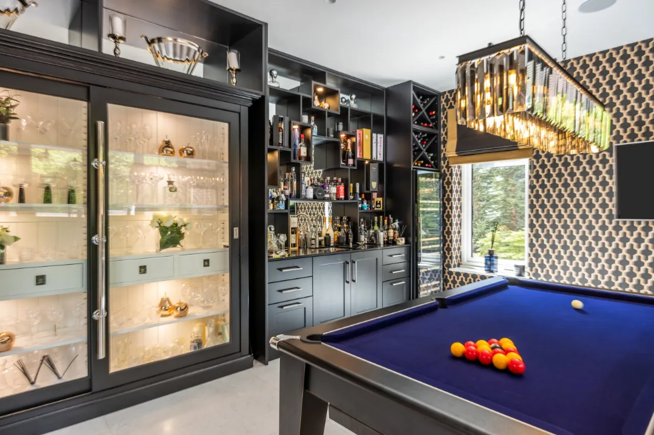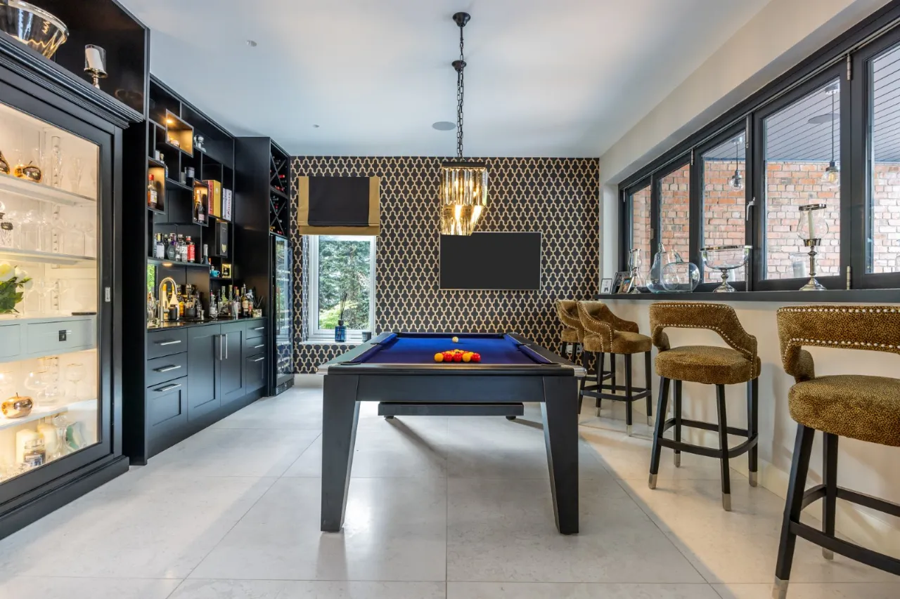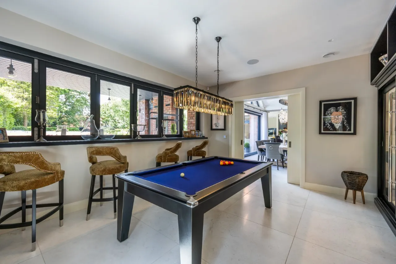 Tiled floor, free standing large cabinet with built in glass storage, backlit with built in cabinetry above and around. Side bar with polished marble worktop with mirrored backlit bar area with multi-optics option with storage beneath and double sized wine fridge with storage above. Wired for Sonos. Provision for widescreen TV, waist height full width window overlooking BBQ area in concertina style which opens to both left and right, making this room and indoor/outdoor party room and opens to covered BBQ area with gas fire, outdoor dining area and gardens.