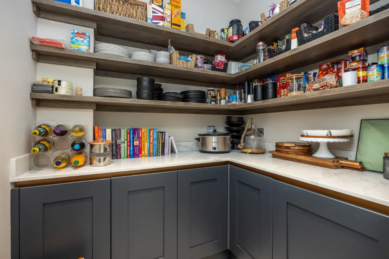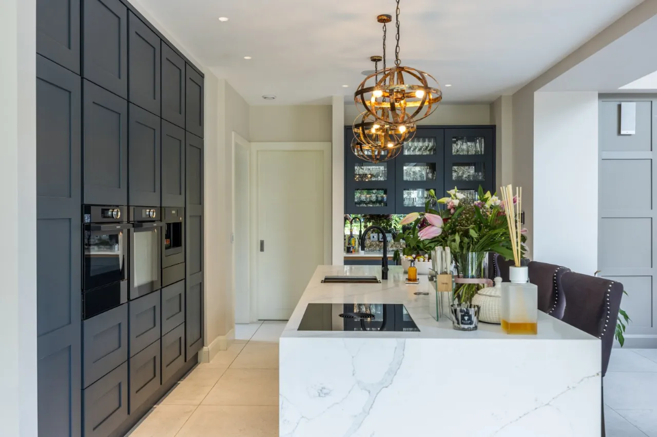 Bespoke kitchen with tiling. Large island unit with marble worktops, Franke style sink and drainer with Quooker tap including Cube , Bora downdraft four ring cyclone cooker, array of cupboards, drawers, shelves and units and four high back chairs at breakfast bar. Side panel with wine fridge, cabinetry, coffee dock area with antique style mirrored background with built in cabinetry above for glassware, full size fitted fridge, De Dietrich oven, combi microwave oven and two warming drawers, full size freezer with built in cabinets. Wired for Sonos. Side pantry with remote lighting, ample built in cupboards, open shelving, integrated fridge and marble worktops.