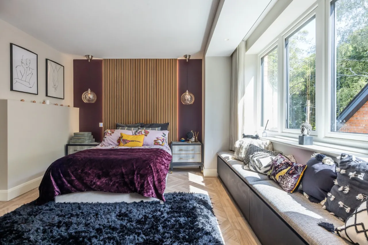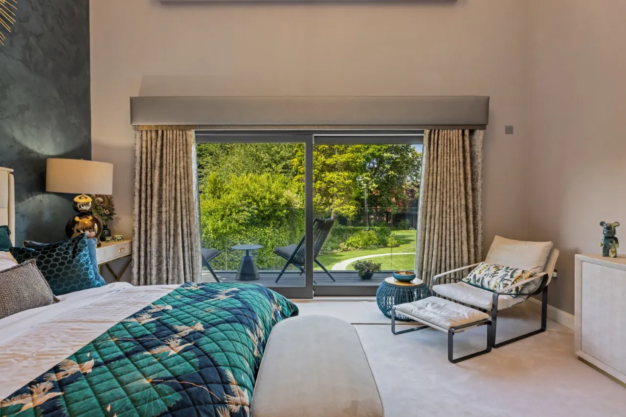 Ceiling height of 6.8 metres. Amazing bedroom with space for wall mounted TV, automated curtains and blind, sliding door to large balcony with glazed balustrades overlooking rear south west facing gardens and entertainment areas. Door to: