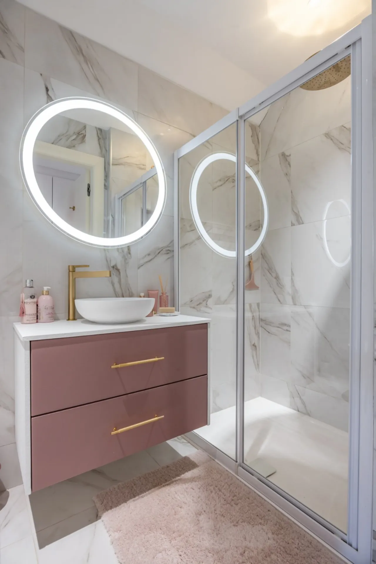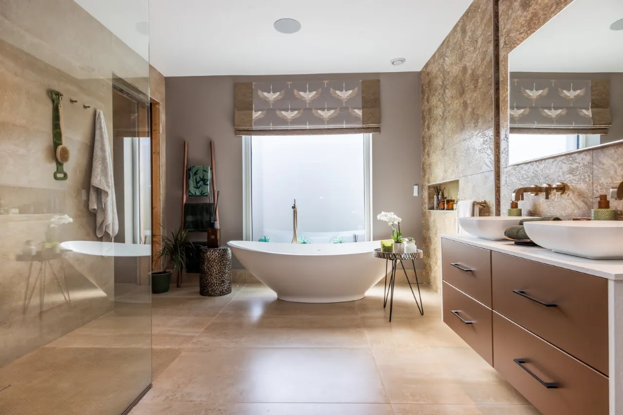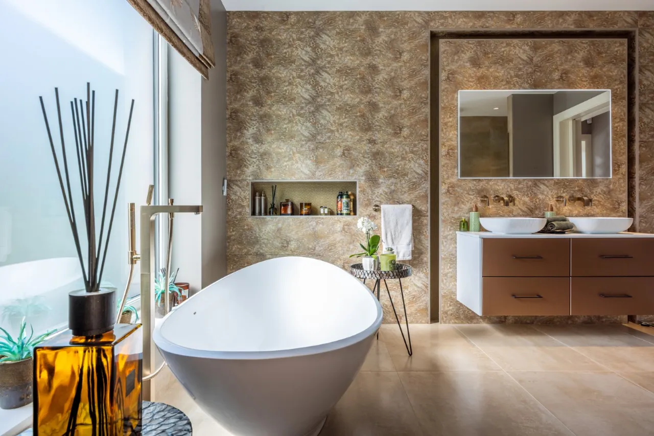 Freestanding oval shaped bath with taps and telephone hand shower, dual sinks in vanity unit with marble bowls and four drawer storage beneath. Heated towel rail, bespoke tiled walls and floor, fitted mirror, large walk in shower with seating area, drench shower and telephone hand shower. Pocket door leading to low flush wc, light well, feature tiled walls and side light. Feature lighting. Automated blind. Wired for Sonos. Door to: