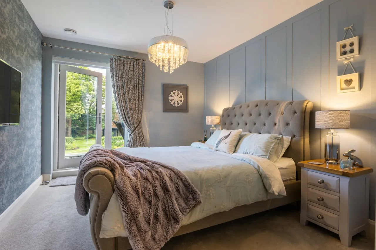 Door to shared first floor balcony overlooking gardens, automated blind, panelled walls, low voltage lighting, two double built in wardrobes, walk in shower room, double shower with drench shower, telephone hand shower, low flush wc with concealed cistern, vanity unit with taps, mirror over, heated towel rail, built in storage, tiled walls, tiled floor.