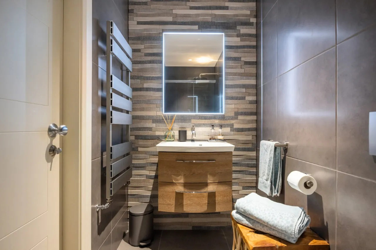 Velux window, door to shower room. Fully tiled shower cubicle with drench shower and telephone hand shower, open storage, wc with concealed cistern, vanity unit with backlit mirror and heated towel rail. Door to: