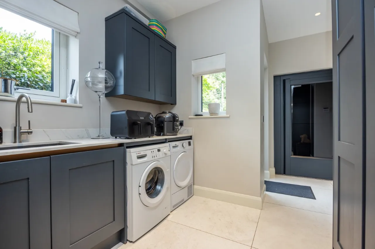 Tiled floor, side door to left, space for washer and dryer, marble worktops with splashbank, sink and additional WC, concealed cistern, wash hand basin, tiled floor, extractor fan. Laundry area with built in shelving and hanging space, laundry shoot from first floor and elevator to first floor landing.