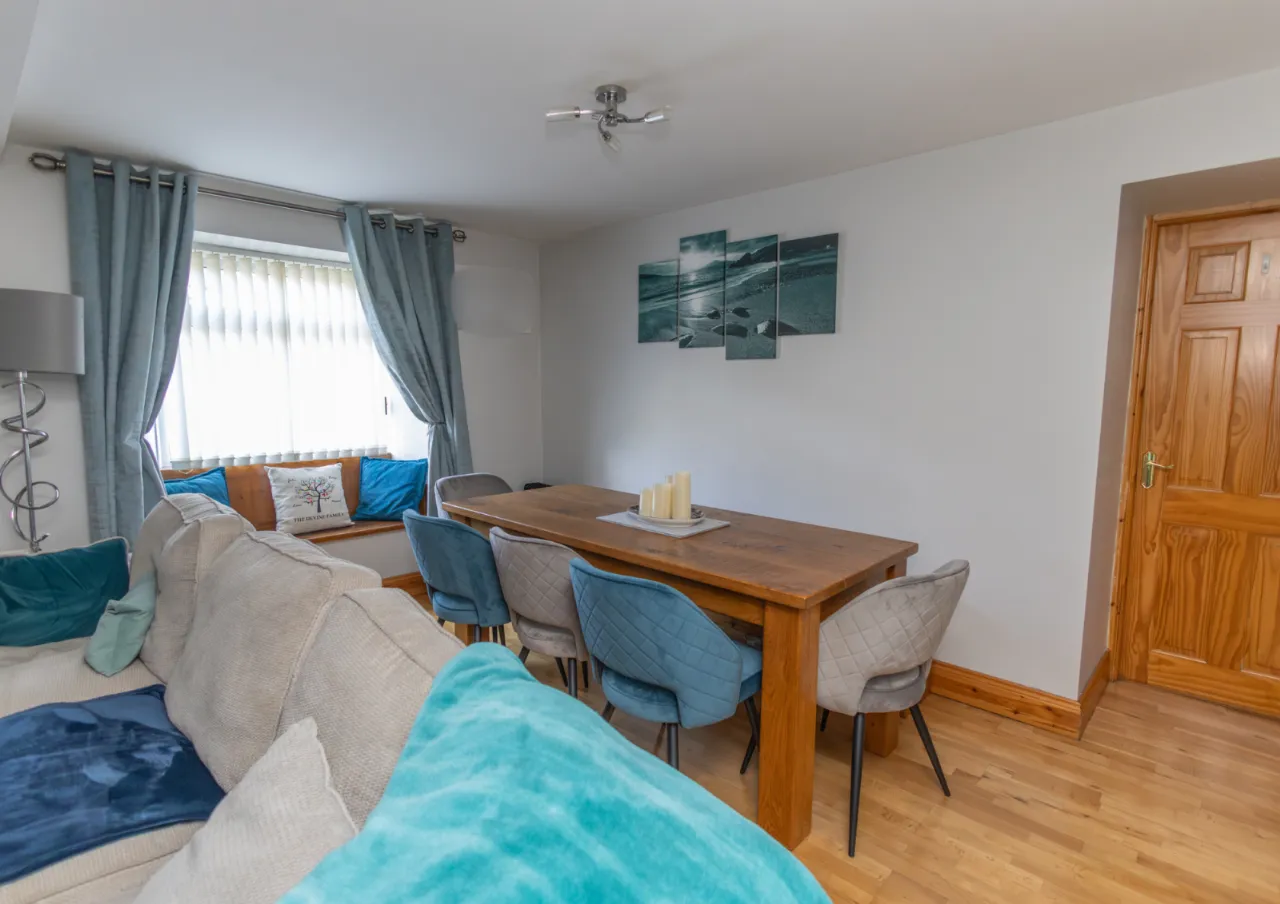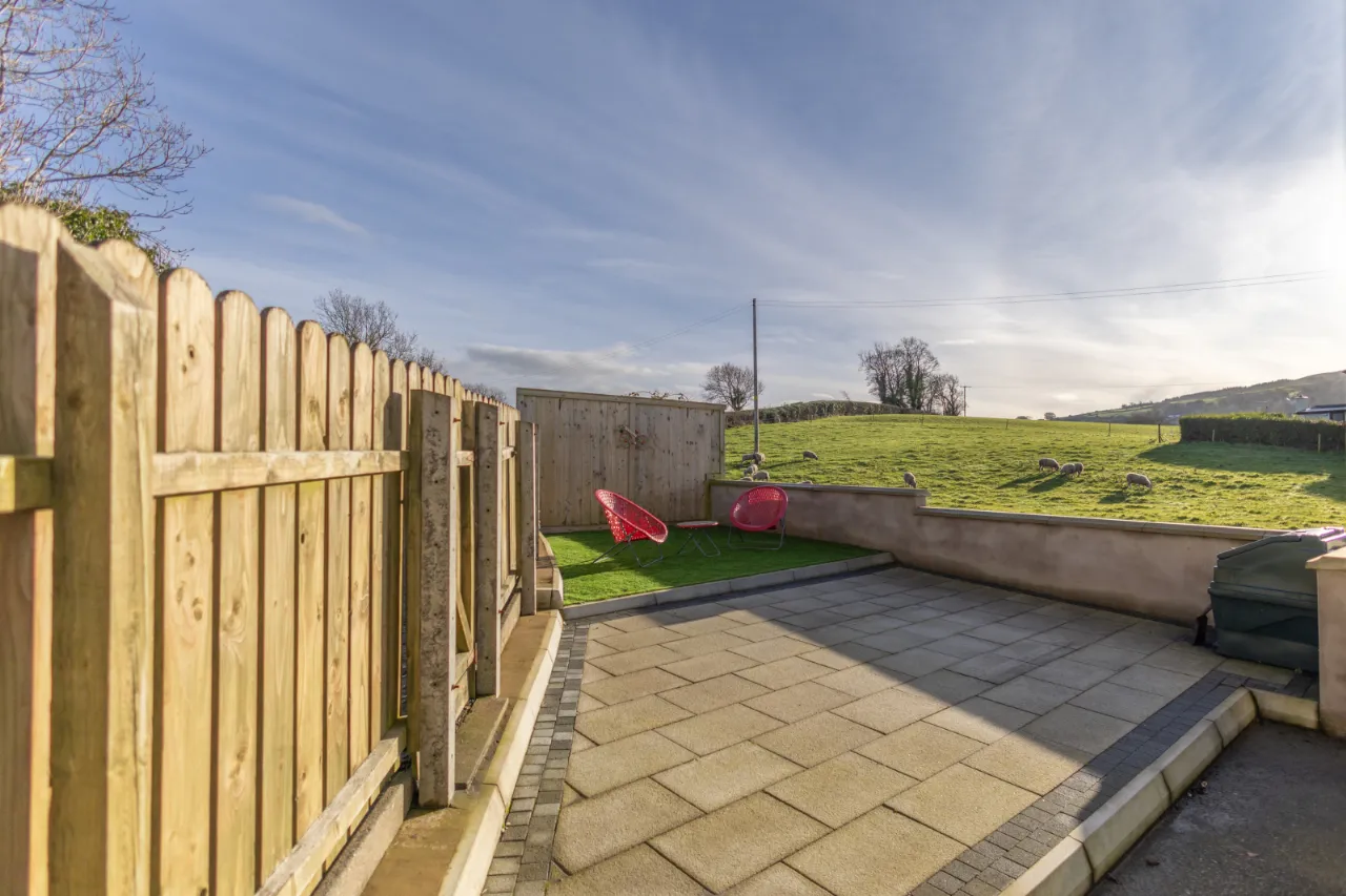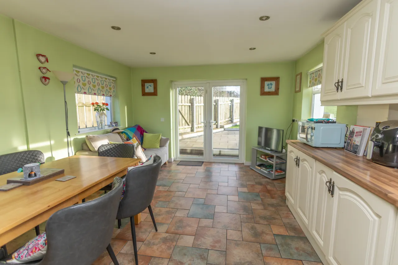 Tiled floor, high and low level storage units, tiled splashback surround, 6th Sense cooker, Beko electric hob, double basin sink, double patio doors leading to rear yard.