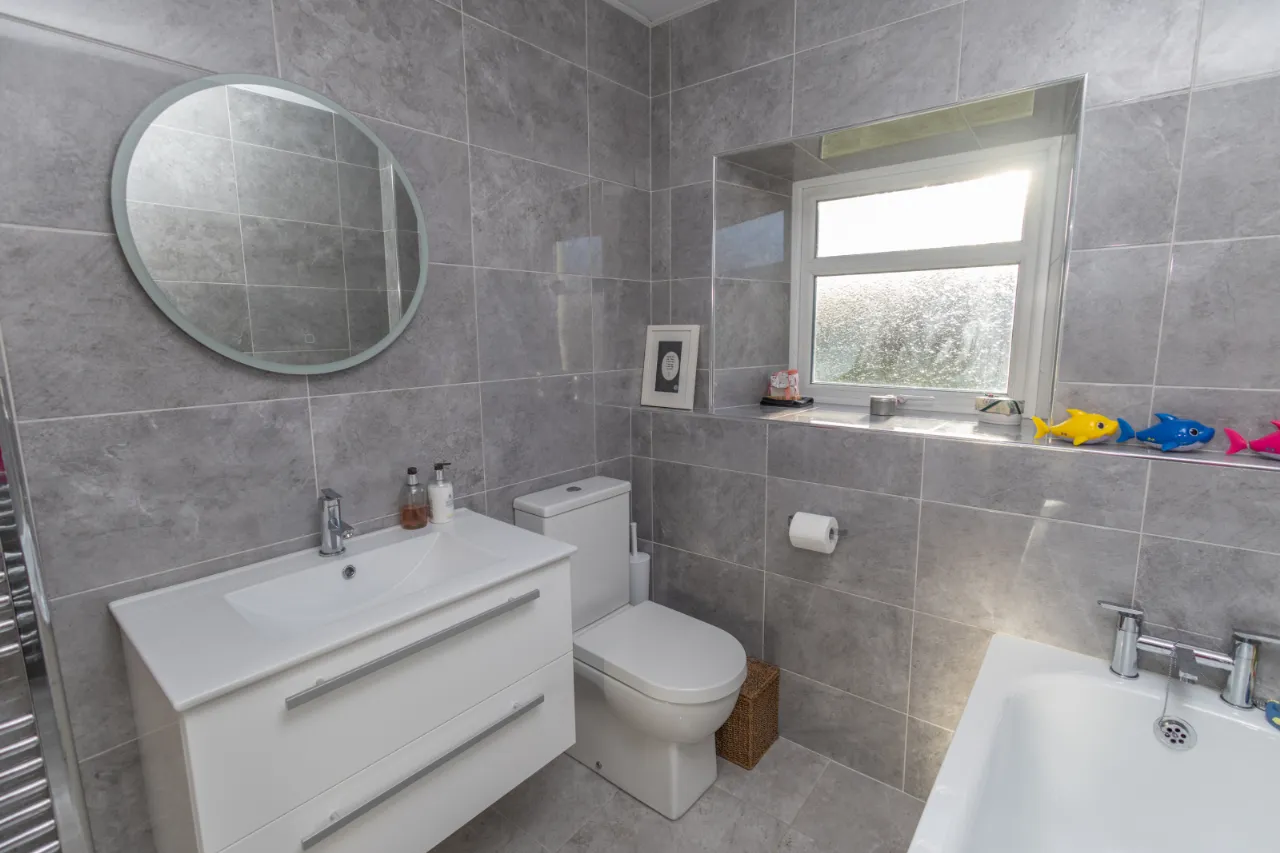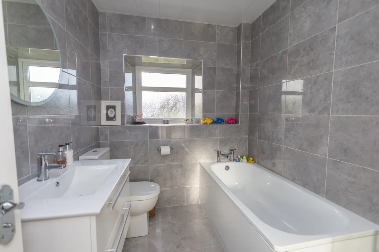 Fully tilled surround, PVC ceiling with recessed down lights, bath, toilet, sink.