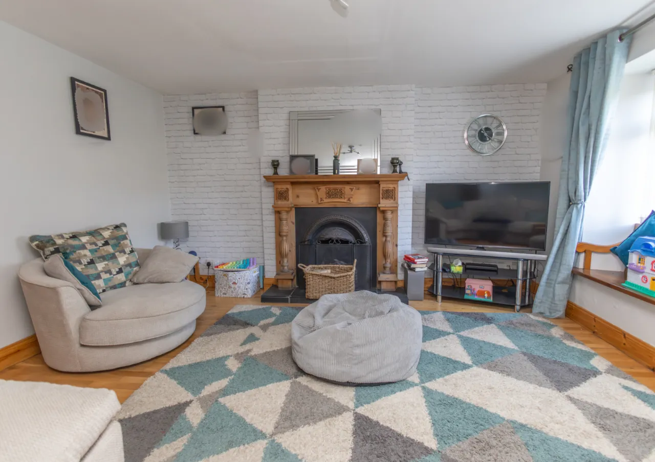 Wooden floor, wooden fireplace with tiled hearth, radiator, 2x bay windows.