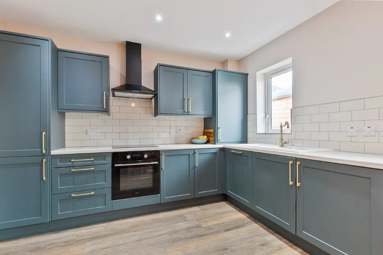 Mix of high quality low and high level units, oven, induction hob and hood, Belfast sink with brass mixer tap. Plumbed for fridge freezer, integrated dishwasher, gas boiler, double doors to garden