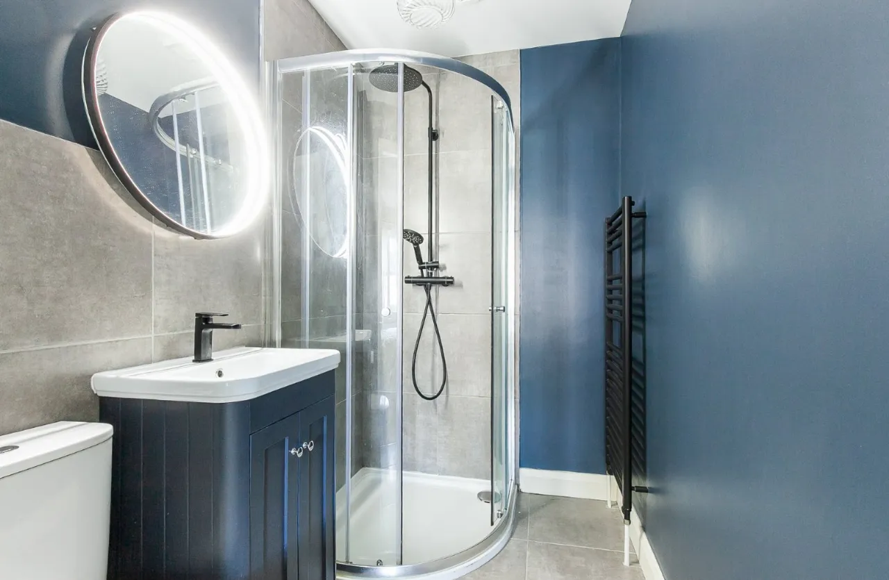 Tiled, low flush WC, sink with mixer tap, corner shower with dual showerhead